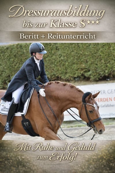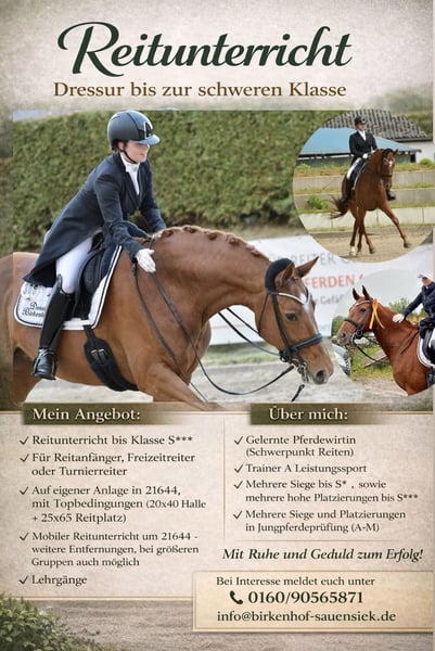 Über mich: - Gelernte Pferdewirtin mit dem Schwerpunkt Reiten - Mehrere Siege in der Dressur bis Klasse S*, sowie mehrere hohe Platzierungen bis S*** - Mehrere Siege und Platzierungen in Dressurpferdeprüfungen (A-M) - Trainer A Leistungssport Ich biete: - Abwechslungsreiche Ausbildung (Stangentraining, Doppellonge, Freispringen usw.) - Kein Anreiten! - Die Pferde werden individuell und mit der nötigen Zeit ausgebildet. Das Wohl des Pferdes liegt uns sehr am Herzen. - Sehr gute Futterqualität, mit genügend Heu! - Täglich Weide/ Paddock / Führanlage - Es gibt keine Stehtage! - Turniervorstellung bis S*** - Die Pferde werden je nach Bedarf zusätzlich mit Magnetfeld, Laser oder Mittelfrequenz Elektrotherapie behandelt - Betreuung von Pferd und Reiter, gerne Unterstütze ich Sie mit Beritt in Kombination mit Unterricht - Ponyberitt - Allergikerboxen (Späne) Das Pferd wird bei uns als Gesamtpaket betrachtet. Neben gutem Reiten, gehört auch ein gutes Futtermanagement, gute Zusammenarbeit mit Hufschmied, Physiotherapeut usw. dazu! Die Liebe zum Pferd steht bei uns an erster Stelle! Wir wünschen uns gerne eine langfristige und erfolgreiche Zusammenarbeit! Preis: 990€ zzgl. Mwst. (1178,10€) www.birkenhof-sauensiek.de Außerdem biete ich auch Reitunterricht an, sowohl bei uns auf der Anlage, als auch mobil! Preis: 50€ (pro Reitstunde)