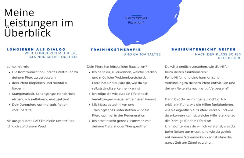 Gesunderhaltendes Pferdetraining - Bodenarbeit (LAD), Reha & Reitunterricht Individuelles Training für dich und dein Pferd! Ich biete pferdefreundliches Training im Raum Nürnberger Land an. Meine Schwerpunkte: - Bodenarbeit und Longieren als Dialog (Osteodressage) - Faszientraining und Rehatraining, gerne in Kombination mit Trainingstapes - Reitunterricht mit Fokus auf Sitz & feinen Hilfen, ich möchte, dass du verstehst, wie die Hilfen beim Reiten wirklich funktionieren und nicht nur die Anweisungen des Trainers ausführst. Ich biete folgende Trainingsmodelle: 55€ - Einzelunterricht (45min) zzgl. Anfahrt ab 10km um Lauf a.d. Pegnitz 30ct. /pro km (Bei mehreren Trainingsteilnehmern am Stall, wird die Anfahrt entsprechend aufgeteilt) Kurse, Gruppenstunden auf Anfrage Du wohnst zu weit weg? Gerne biete ich auch Onlineunterricht an! Du hast Interesse oder noch Fragen? Melde dich bei mir, gemeinsam erarbeiten wir ein individuelles Konzept für dich und dein Pferd.