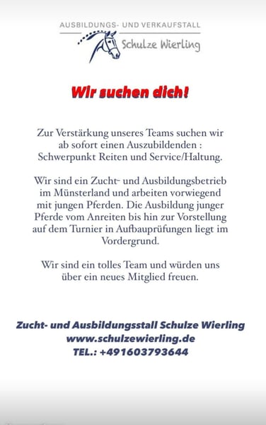 Wir suchen sowohl einen Auszubildenden als auch einen Bereiter. Bei weiteren Fragen melden dich gerne.