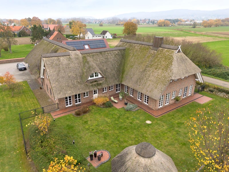 Ein Refugium im Mindener Westen: Zwischen den weitläufigen Wiesen des Mindener Westens öffnet sich hinter einem zweiflügeligen Schmiedeeisentor ein privates Refugium, das man in dieser Form nur äußerst selten findet. Auf einem beeindruckenden Areal von rund 25.690 m² erhebt sich ein mit Reet gedecktes Anwesenensemble, das Ruhe, Naturverbundenheit und architektonische Individualität auf außergewöhnliche Weise vereint. Ein Anwesen wie ein eigener Kosmos. Nach Passieren der elektrischen Zufahrt gelangt man in einen geschützten Innenhof, der von mehreren Gebäudevolumen eingerahmt wird: dem Hauptgebäude, einer reetgedeckten Scheune sowie ergänzenden Funktionsbereichen. Bereits hier wird die besondere Atmosphäre spürbar – großzügig, privat, vollkommen abgeschirmt und geprägt von traditionellen Baustoffen, die sich harmonisch in die Umgebung einfügen. Das Haupthaus eröffnet eine Wohnfläche von ca. 405 m², während eine eigenständige Einliegerwohnung zusätzlich rund 56 m² beisteuert. Charakteristisch für das Wohnkonzept sind klare Sichtachsen, repräsentative Raumhöhen und der direkte Bezug zur umgebenden Natur. Von der Diele aus entfaltet sich das Erdgeschoss: ein weitläufiger Wohn- und Essbereich mit Blick über die Wiesenlandschaft, eine gemütliche Wohnküche, ein Gästezimmer, ein Elternschlafbereich mit Ankleide sowie helle Aufenthaltsräume mit klassischen Sprossenfenstern. Landhausarchitektur in ihrer schönsten Form. Die Wohnräume sind durchgängig geprägt von großzügigen Türen, Holzsprossenfenstern und besonders angenehmen Lichtstimmungen. Mehrere Terrassen schaffen Rückzugsorte für jede Tageszeit – während ein Pavillon mit Reetdach im Garten als zusätzlicher Ruhepol dient. Im Sommer spielt sich das Leben auf den unterschiedlich positionierten Außenbereichen ab; an kühleren Tagen laden zwei Kamine zu wohliger Atmosphäre ein. Privatsphäre auf mehreren Ebenen: Im Obergeschoss öffnet sich zunächst eine Galerie mit Blick in den Wohnbereich. Mehrere Zimmer – ideal als Kinder-, Gäste- oder Arbeitsräume – sowie die Option, zusätzliche ca. 57 m² auszubauen, schaffen Flexibilität für zukünftige Lebenssituationen. Die Einliegerwohnung kann separat oder über das Haupthaus erreicht werden und eignet sich perfekt für Gäste, Au-Pair oder Homeoffice. Technik & nachhaltige Energieversorgung: Die Eigentümer investierten kontinuierlich in die Modernisierung des Anwesens. Dazu zählen unter anderem: - Photovoltaikanlage (ca. 21 kWp, Baujahr 2013) - moderne Pelletsystem-Heizung ( 2013) - Fußbodenheizung im Erdgeschoss - hochwertige Holzfenster, 2017 neu lackiert - maßgefertigte Tischlerarbeiten in verschiedenen Bereichen - gepflegter Pferdestall mit vielseitigen Nutzungsmöglichkeiten Courtage Die Maklercourtage beträgt 3,57% der notariellen Kaufsumme inkl. 19% Umsatzsteuer. Sie ist verdient und fällig bei Abschluss eines notariellen Kaufvertrages und vom Käufer zu zahlen. Wir sind berechtigt, auch für den anderen Vertragspartner provisionspflichtig tätig zu werden. Grunderwerbssteuer, Notar- und Gerichtskosten sind vom Käufer zu tragen. Im Übrigen gelten unsere Allgemeinen Geschäftsbedingungen. Irrtum und Zwischenverkauf vorbehalten. Hinweis Alle Angaben sind ohne Gewähr und basieren ausschließlich auf Informationen, die uns von unserem Auftraggeber übermittelt wurden. Wir übernehmen keine Gewähr für die Vollständigkeit, Richtigkeit und Aktualität dieser Angaben. Die in diesem Exposé enthaltenen Informationen und Anhänge sind ausschließlich für den bezeichneten Adressaten bestimmt. Die Verwendung, Vervielfältigung oder Weitergabe der Inhalte und Anhänge ist strengstens untersagt. Der Maklervertrag mit uns kommt durch schriftliche Vereinbarung oder durch die Inanspruchnahme unserer Maklertätigkeit auf der Basis des Objekt-Exposés und seiner Bedingungen zustande.