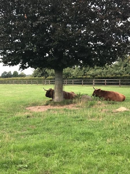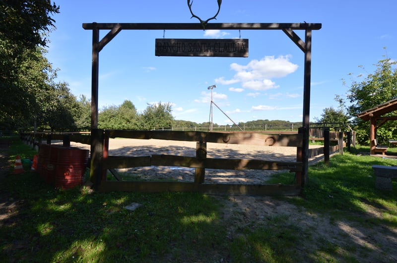 En el extenso terreno se encuentran praderas para caballos, una pista de equitación, cuatro boxes (ampliables) y dos establos separados para burros. La vivienda de los animales está en armonía con el entorno natural, ofreciendo condiciones ideales para amantes de los caballos y animales. El conjunto se complementa con un estanque de aproximadamente 2.500 m² con un arroyo, huertos frutales, variedades antiguas de frutas en una alameda, robles y más de 1 km de setos de hayas.
