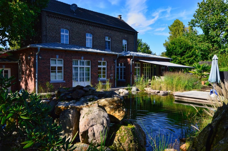 The extensive grounds feature horse meadows, an equestrian arena, four horse stalls (expandable), and two separate stables for donkeys. The horsekeeping is designed to be species-appropriate, integrated into the natural surroundings, and offers ideal conditions for horse and animal lovers. The estate is further complemented by a approximately 2,500 m² pond complex with a stream, fruit orchards, old fruit varieties in an alley, mature oak trees, and over 1 km of beech hedges.