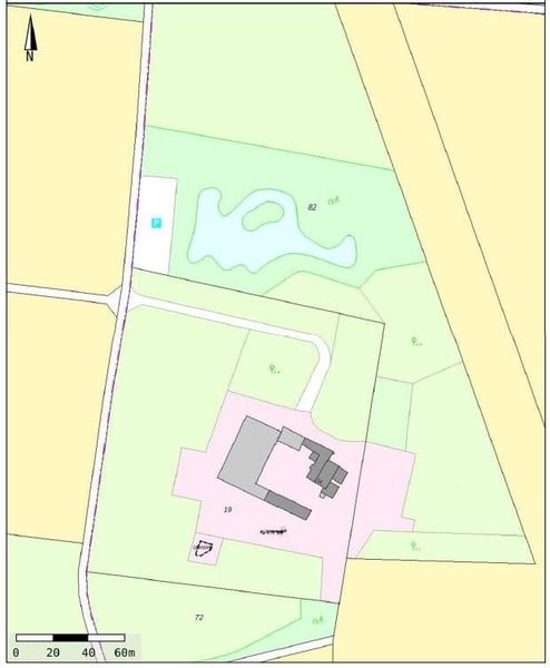 Property details: approximately 61,000 m² with about 600 meters of road frontage, as well as field and farm roads.