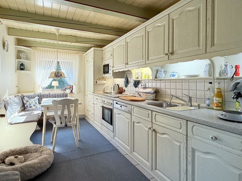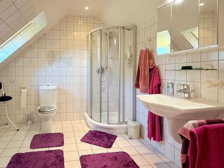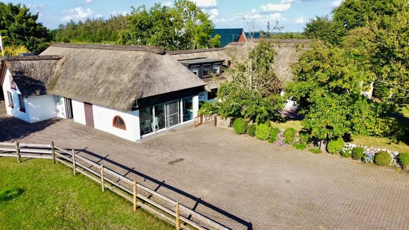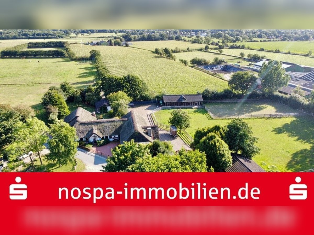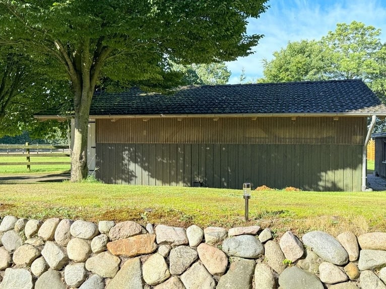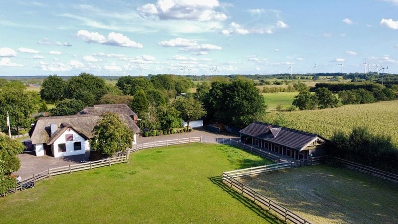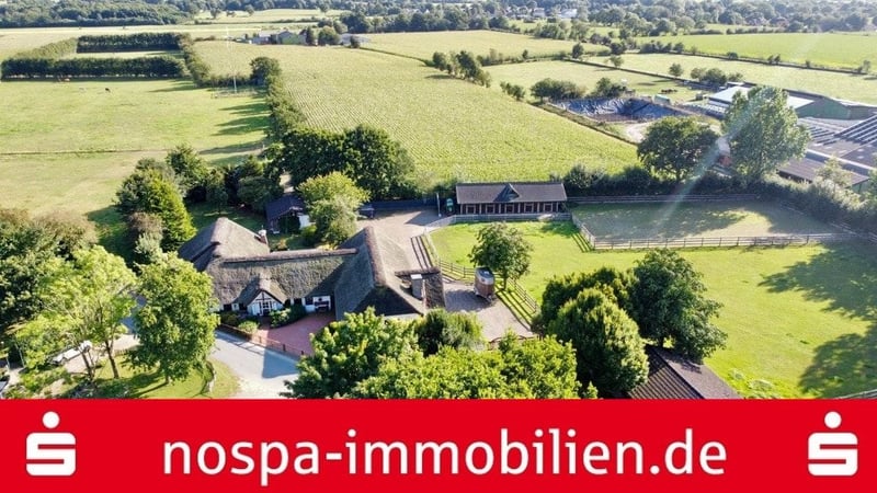 Arlewatt, located in the heart of the North Frisian horse breeding region Well-maintained, traditional thatched-roof estate on approximately 3.38 hectares (rounded), featuring an easy wind turbine and photovoltaic system, situated close to the district town of Husum and the UNESCO World Natural Heritage Site Wattenmeer/North Sea. A paradise for horse enthusiasts: This spacious property, classified as a "Special Area for Equestrian Sports" according to the local land use plan, boasts three horse stables with a total of 11 boxes, an outdoor riding arena, a pasture shelter, and ample greenland, making it an ideal retreat for horse lovers. Situated in close proximity to the North Sea and the UNESCO World Natural Heritage Site Wattenmeer, this thatched-roof estate is set on a roughly 3.38-hectare, rounded plot right in the heart of North Frisia. A paradise for horse lovers: The estate includes three horse stables, 11 boxes, an outdoor riding arena, and a pasture shelter on its own grounds, all within a designated "Special Area for Equestrian Sports," making it a true haven for equestrians. The charming thatched-roof residence exudes a landscape-typical ambiance. The outbuildings and landscaped outdoor areas transform this ensemble into a real gem. The over 100-year-old estate, continuously renovated and modernized, offers approximately 165 m² of living space and about 28 m² of utility space. The additional buildings provide a total of around 357 m² of usable area. The entire property spans approximately 33,782 m². Layout: Main house with thatched roof (approx. 165 m² living space and 28 m² utility space): Ground floor: Spacious living/dining room with a tiled stove (currently out of operation) and a terrace with a canopy, an additional room, kitchen with fitted kitchen, pantry, shower/bathroom, utility room, hallways. Upper floor: Bedroom with an adjoining dressing room, shower bathroom, hallway, storage rooms. Garage with electric door. Horse stable adjacent to the main house (approx. 115 m² utility space): Includes 2 boxes for large horses, 2 boxes for ponies, and an open area in front of the boxes, a conservatory, saddle room, heating room, and space for oil tanks. Farm building: Detached horse stable (approx. 50 m² utility space): Steel construction with wooden elements, gabled roof, 4 horse boxes, and an additional box for storage or equipment. The horse drinking troughs are heated. Separate horse stable on pasture land with private access (approx. 110 m² utility space): Steel/wooden construction with gabled roof, 3 horse boxes, and an open area in front. Open stable (approx. 15 m² utility space): Located on the pasture. Solid garden shed (approx. 22 m² utility space): A sturdy garden shed with a gabled roof and a lighted door. Wooden garage (approx. 45 m² utility space): Constructed in timber frame. The property has been continuously renovated and modernized. An outdoor riding arena and grazing land complete this equestrian paradise. There is also an easy wind turbine and a photovoltaic system installed on the property. Heating is provided by an oil central heating system from 1989, with an energy demand certificate indicating 373.0 kWh/(m²) and class H. Available by arrangement. Purchase price: €695,000 Well-maintained condition: This historic thatched-roof estate with an extension has been regularly renovated and modernized. Close to the North Sea: Husum and the Wattenmeer UNESCO World Heritage Site are just a few kilometers away. Garage and parking: In addition to the main garage, there is a wooden garage (approx. 45 m²) and several open parking spaces. Wind turbine: An Easy-Wind system is installed on the property. Photovoltaic system: Own system installed. Private well: A private well is present on the estate. Private sewage system: A small private treatment plant with a communal treatment pond. Functional layouts: The estate is very spacious, offering approximately 165 m² of living space and about 28 m² of utility space in the main house. Farm building for equestrian use: See page 5. Conservatory: The estate features a conservatory attached to the horse stable part of the main house. Horse boxes: Distributed across three horse stables, the property has a total of 11 horse boxes. Riding arena: Short distances guarantee convenience: located close to the main house and near one of the stables, with a drained, sand-based surface and two irrigation systems. Friesenwall: As a landscape-typical feature, the estate includes a Friesenwall (a traditional dyke or earth wall). Thatched roof: The roof of the main house and the adjoining horse stable are covered with thatch. Solid garden shed: A sturdy garden shed for tools and workshop needs, easily accessible from the main house. Heating and fireplace: The main house is heated by an oil central heating system from around 1989, located in the adjoining horse stable. Additionally, the living/dining room features a tiled stove (currently out of operation).