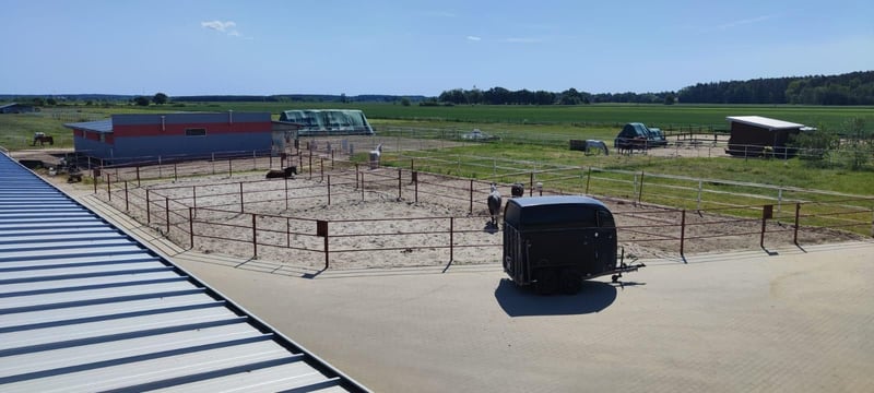 Reithalle (gebaut 2020): 48m x 23m, ausgestattet mit neuem Quarzsubstrat (2023) mit automatischer Bewässerung von unten