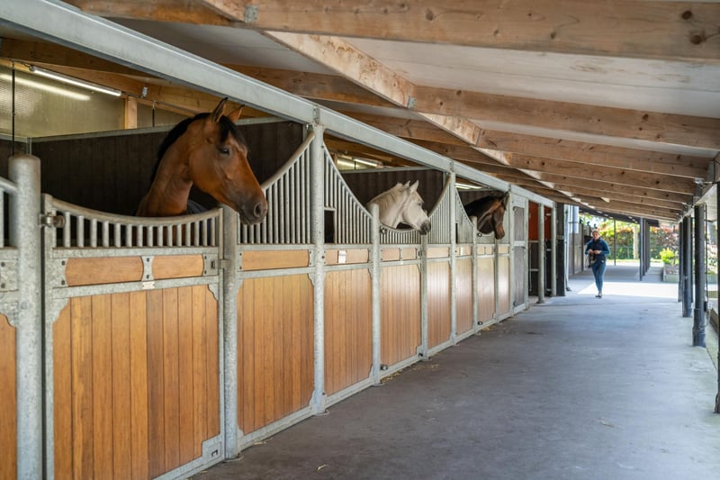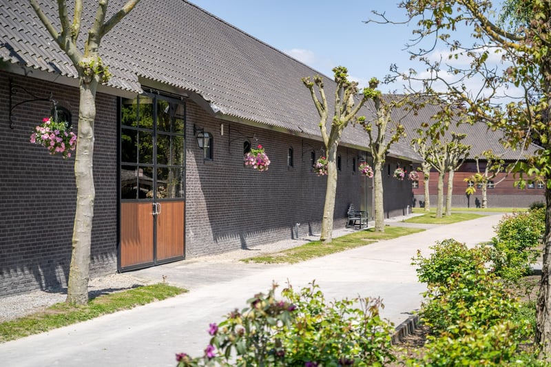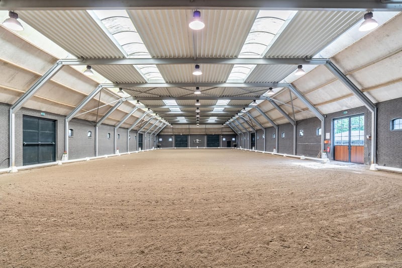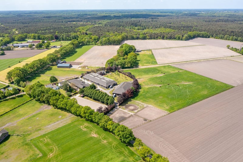This beautiful, complete equestrian accommodation offers plenty of possibilities thanks to the presence of a detached house and living areas, a total of 33 horse stalls divided over various units, a spacious indoor and outdoor arena (approx. 22×62 metres), a storage shed with rearing stalls and large pastures. In addition, the property is situated in a beautiful location with plenty of privacy and on the edge of the Leenderbos forest with excellent riding opportunities! The cities of Eindhoven and Weert, as well as Eindhoven Airport, are a 20-minute drive away. Tops International Arena is only 15 km away, and Equestrian Centre De Peelbergen and Sentower Park are also approximately 45 minutes away by car. Offers are welcome from €2,950,000 (costs payable by buyer). LIVING ACCOMMODATION Detached farmhouse (no. 14): This spacious detached farmhouse, finished with high-quality materials, is located on the left side of the plot. The ground floor of the house features a spacious hall, a large living room with open kitchen and a practical utility room. The first floor has two spacious bedrooms, with the master bedroom featuring an en-suite bathroom and the second bedroom featuring a spacious walk-in wardrobe. Office space / grooms’ accommodation (no. 12): This detached farmhouse is intended as office space and is currently used to accommodate interns and grooms. It is the former farmhouse and all living areas are still present in this property. The ground floor includes a living room, kitchen, utility room, two bedrooms, shower room and a porch. The first floor has a walk-through room, a third bedroom and a spacious bathroom. RIDING HALL The detached riding hall is constructed of masonry facades with steel trusses. The roof of the fully insulated hall is covered with tiles. Various doors in the front, side and rear façades provide access to the yard from the indoor arena. Various windows and skylights in the roof provide plenty of natural light. LED lighting is also available. The riding hall is also equipped with mirrored walls. The indoor arena measures approximately 22 x 62 metres and is equipped with an ebb and flow floor and various mirror walls. HORSE STABLE On the outside of the detached stable, there are 8 stables, in 2 units of 4 boxes. The outdoor stables (approx. 4×4 metres) on the left-hand side are equipped with partly plastic and partly galvanised front walls with brickwork between and rear walls and sliding doors. The four stalls (approx. 3 x 3.5 m) on the right-hand side have lowered bamboo front walls with hinged doors and plastic partition walls. These stables have two washing areas, which are equipped with hot water. There is also a storage room. The horse stable is further divided into three units with a total of 20 horse stalls. The insulated stable is constructed of masonry with steel trusses and also has a tiled roof. French doors provide access to the yard from all units. In addition to 11 horse stalls, the first stable unit also has 4 washing areas, a tack room, a laundry room and a toilet. The stalls (approx. 4×4 metres) are equipped with partly plastic and partly galvanised front walls with sliding doors and brick partition walls. Six stalls have an outside hatch. Stable section II has six horse stalls (approx. 4×4 metres) with partly plastic and partly galvanised front walls with sliding doors and concrete partition walls. The unit also features attractive wooden trusses. The third stable section has 3 more stalls, all of which have an outside hatch. The stalls have partly plastic and partly galvanised front walls with sliding doors and concrete partition walls. STORAGE SHED/REARING STABLE The very spacious shed is currently used as storage space and is partly furnished with five horse stalls and two walk-in stalls. Of course, the shed is suitable for multiple purposes. The brick facades of the fully insulated shed are largely clapboard on the outside. The roof is covered with tiles. French doors in the front and side walls provide access to the yard. The mare/foal stall measures approximately 5×5 metres and the other 4 stalls measure approximately 3×3.5 metres. The stalls are fitted with partly plastic and partly galvanised front walls with sliding doors and plastic partition walls. A fixed staircase provides access to a spacious attic, which covers the entire surface area of the shed. OTHER FACILITIES The outdoor arena measures approximately 22 x 62 metres and has an ebb and flow floor. The arena is beautifully situated, surrounded by greenery. The Liberty horse walker next to the stable is suitable for five horses. The horse walker has a clinker floor and a wooden fence. The lunging circle has a sand floor and a wooden fence. There are three paddocks, which have a sand floor and a wooden fence. The paddocks are also accessible via a rear entrance to the plot. The surrounding meadows are also fenced with wood. OPTIONAL FOR SALE: Detached house (no. 8): The ground floor of the house has an entrance hall, a spacious open-plan kitchen, a large sitting area, a utility room, a cellar and an indoor garage. The first floor has three bedrooms and a spacious bathroom. In addition to the detached house, it is also possible to expand the plot area with a plot of cultivated land (meadow) located across the street. The plot has an area of 6,480 m². SPECIAL FEATURES – The entire property is connected to gas, water, electricity and sewerage. – All living areas are fully insulated and double glazed. – Plot numbers 700 and 17 (with accompanying detached house no. 8) are optionally offered for sale. – Plot number 12, located across the street from the house, is also optionally offered for sale. – The riding hall and shed were built in 2007. – A permit is available for the construction of a new shed measuring approx. 20×40 metres, located at the rear right within the building area. – Located in a prime location on the edge of a beautiful forest area, with p