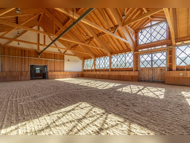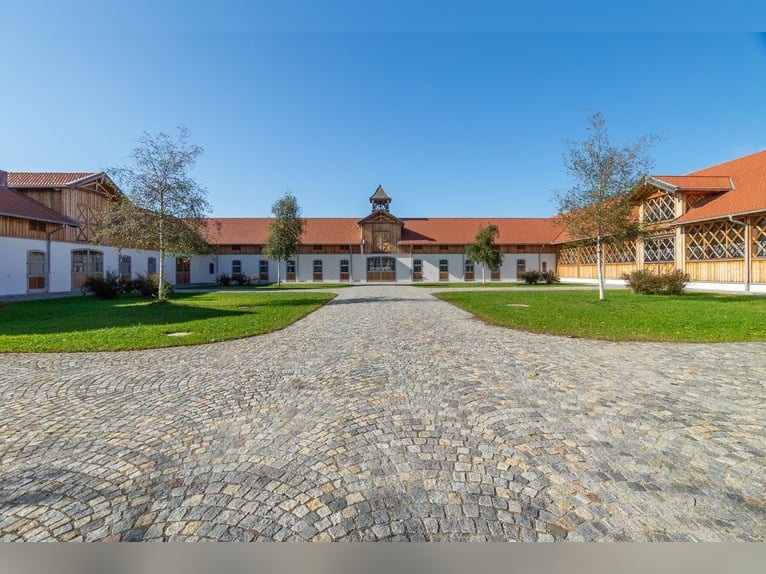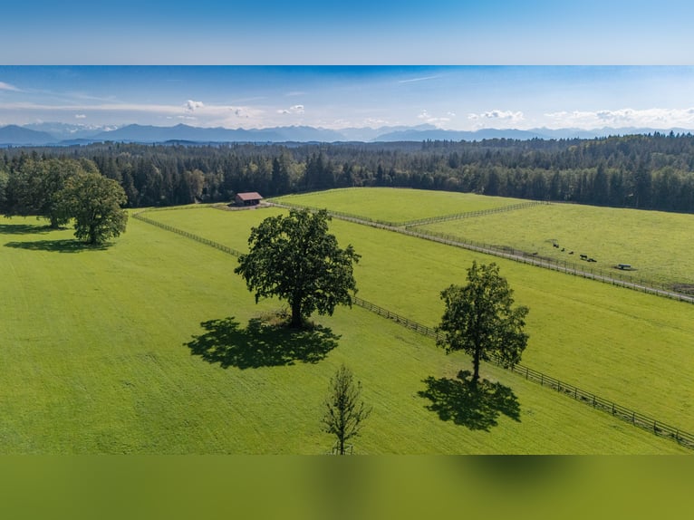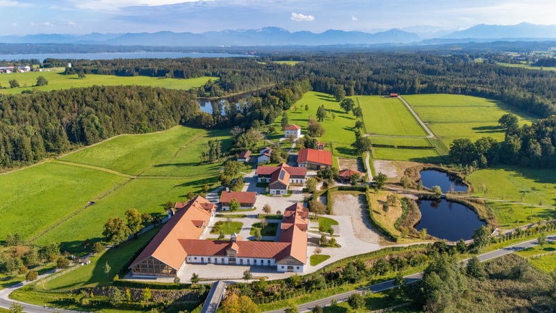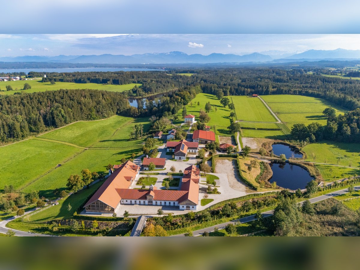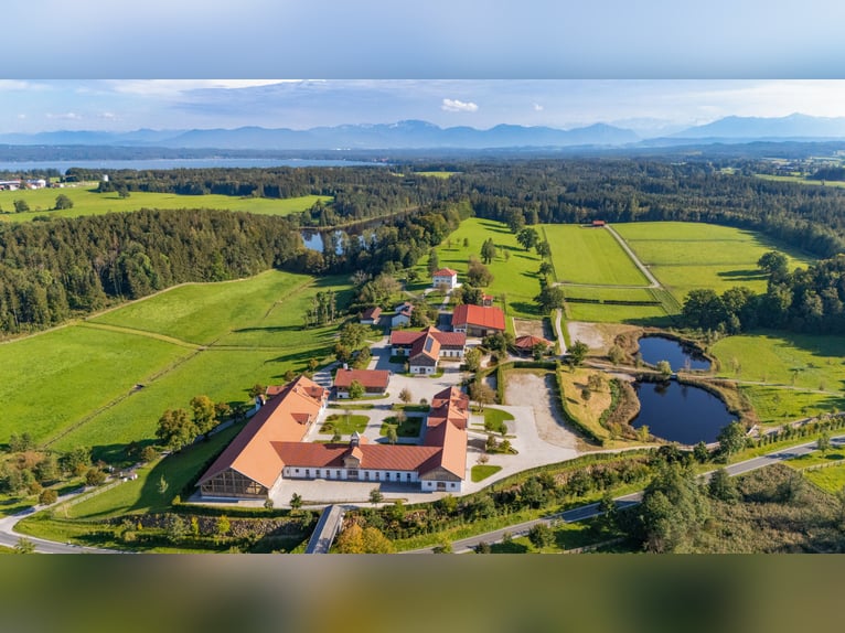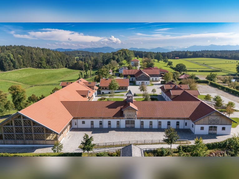 In an absolutely dream location, just about 40 minutes from Munich, lies the property in the beautiful Bavarian foothills, surrounded by meadows, forests, and lakes. In a perfect setting and in complete seclusion, the estate invites private living on a stunning stud farm. Perched above the grounds, with a view of its own pastures, is the spectacular villa, which serves as the private residence on the property. With great attention to detail, the villa has been extensively renovated and now shines in full glory, combining tradition and modernity. With a living area of approximately 568 m², an impressive living environment has been created for first occupancy, which is particularly unique due to the recurring sightlines into the surrounding greenery. The centerpiece of the estate is the spacious three-sided courtyard with large stalls and a light-flooded indoor riding arena. The farm offers ideal conditions for professional and successful horse breeding. The combination of generous stabling, extensive pastures, and modern facilities provides an optimal environment for healthy horse breeding. Two indoor riding arenas, an open stable, a lungeing area, and the prepared riding arenas and sand paddocks create professional standards of the highest quality. _ Living area approx. 1,428 m², usable area approx. 2,655 m² _ Plot size approx. 28 ha _ All ancillary buildings such as staff houses, operational buildings, an open stable, and a horse lungeing area _ 72 stalls, two indoor riding arenas, and two prepared riding arenas _ Building rights for another villa in similarly spectacular location In the event of concluding a purchase contract for the aforementioned property, a buyer's commission of 3.57% including 19% statutory VAT on the notarized purchase price is due. In the context of §§ 656a ff. BGB, the amount of the buyer's commission is, however, limited by the commission to be paid by the seller. The payment of the commission will be regulated in the purchase contract.