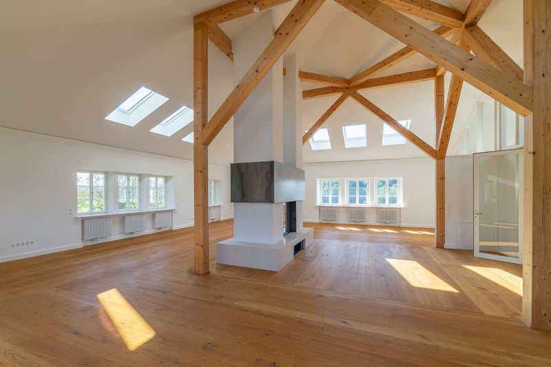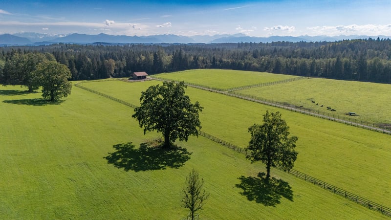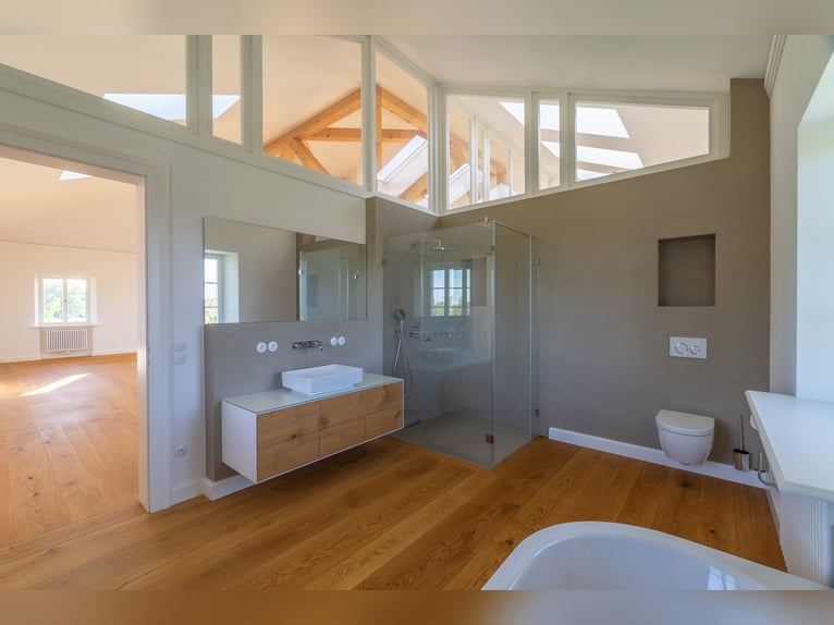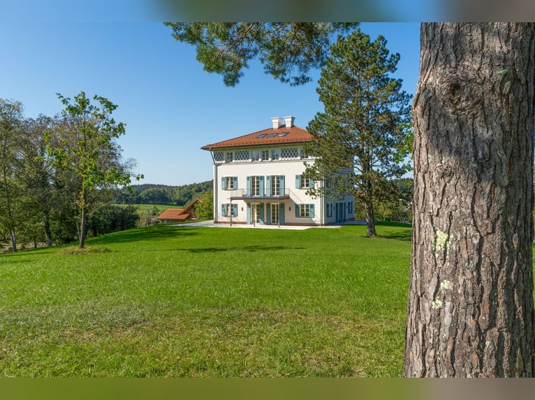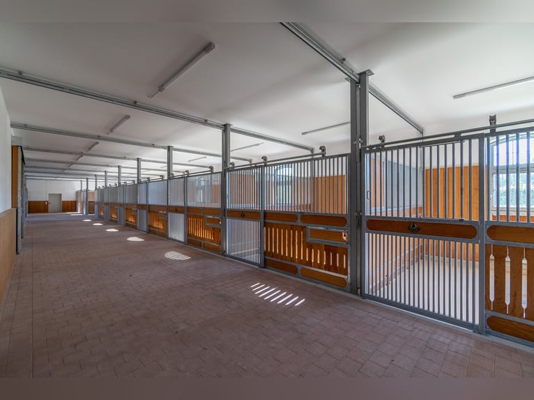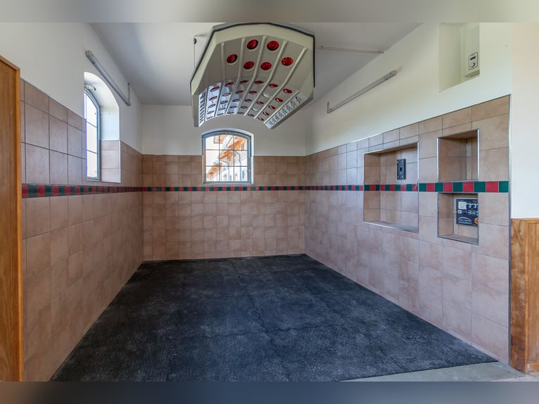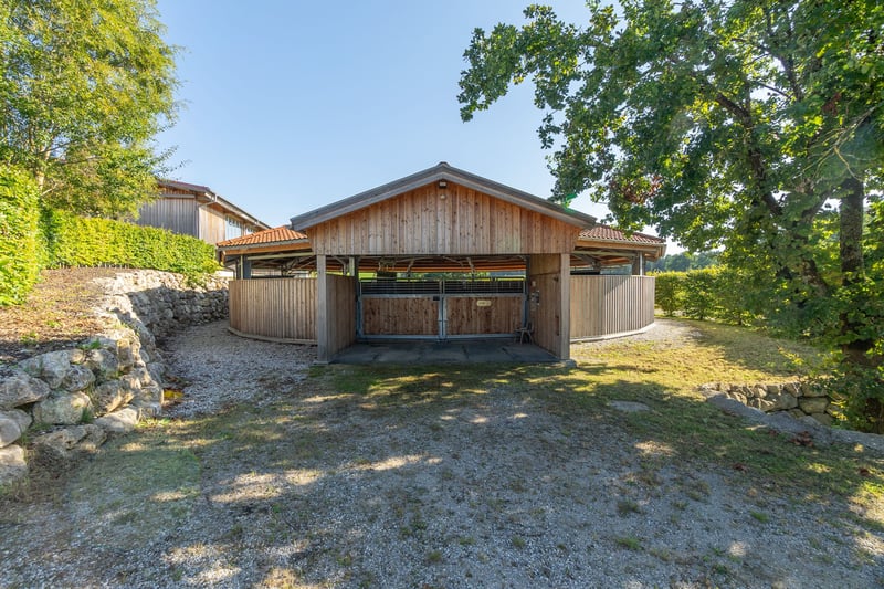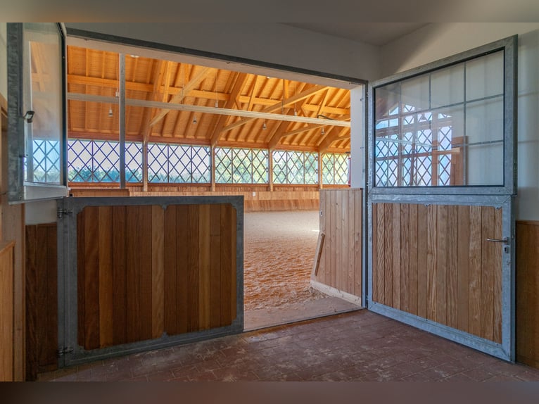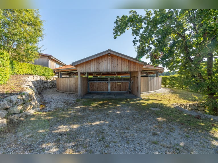 In an absolutely dream location, just about 40 minutes from Munich, lies the property in the beautiful Bavarian foothills, surrounded by meadows, forests, and lakes. In a perfect setting and in complete seclusion, the estate invites private living on a stunning stud farm. Perched above the grounds, with a view of its own pastures, is the spectacular villa, which serves as the private residence on the property. With great attention to detail, the villa has been extensively renovated and now shines in full glory, combining tradition and modernity. With a living area of approximately 568 m², an impressive living environment has been created for first occupancy, which is particularly unique due to the recurring sightlines into the surrounding greenery. The centerpiece of the estate is the spacious three-sided courtyard with large stalls and a light-flooded indoor riding arena. The farm offers ideal conditions for professional and successful horse breeding. The combination of generous stabling, extensive pastures, and modern facilities provides an optimal environment for healthy horse breeding. Two indoor riding arenas, an open stable, a lungeing area, and the prepared riding arenas and sand paddocks create professional standards of the highest quality. _ Living area approx. 1,428 m², usable area approx. 2,655 m² _ Plot size approx. 28 ha _ All ancillary buildings such as staff houses, operational buildings, an open stable, and a horse lungeing area _ 72 stalls, two indoor riding arenas, and two prepared riding arenas _ Building rights for another villa in similarly spectacular location In the event of concluding a purchase contract for the aforementioned property, a buyer's commission of 3.57% including 19% statutory VAT on the notarized purchase price is due. In the context of §§ 656a ff. BGB, the amount of the buyer's commission is, however, limited by the commission to be paid by the seller. The payment of the commission will be regulated in the purchase contract.