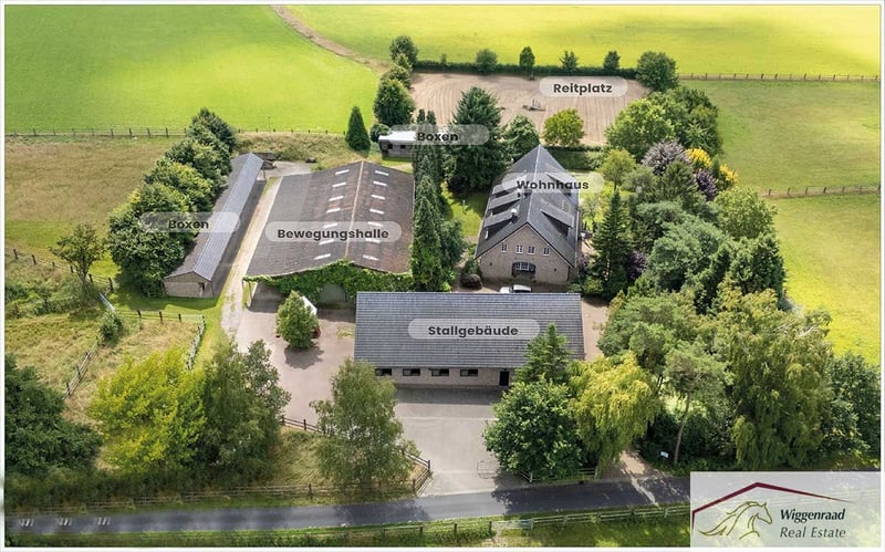 Equestrian Facility Offering the Perfect Balance Between Family Comfort and Horse Passion This estate, comprising four buildings, is set in a fully private, lush green environment on approximately 6.5 hectares nestled between forest and pastures. The main house, approximately 520 m², includes four independent living units with separate entrances. The spacious main living area, about 344 m², features an inviting open-plan kitchen with a stove fireplace and pantry in the entrance hall. An additional room combined with a barrier-free bathroom serves as a comfortable guest wing. The heart of the ground floor is the large, bright, gable-roofed living room with floor-to-ceiling windows, terrace access, and a cozy tiled stove. A small study is accessible from the living room. An authentic hardwood staircase leads to the gallery, illuminated by roof windows, which includes a library. Adjacent to the living room is a large hallway connecting to two bright children’s rooms with a full bathroom, a utility room, and a second staircase that leads to the gable-roofed master bedroom with en-suite bathroom, exposed ceiling beams, and gable view. The upper floor also hosts a staff apartment of approximately 70 m² with an open attic space, as well as a further living unit of around 100 m². All apartments have their own separate entrance. The estate is technically up-to-date, featuring underfloor heating, a bus system, modern insulated classic windows, an electronic locking system, and air conditioning in the master bedroom. An independent groundwater supply, a redundant oil heating system, rainwater drainage for the pastures, and photovoltaic potential ensure future viability and independence. For optimal horse husbandry, the facility offers excellent conditions: eight boxes in the main stable with tack room, rider’s lounge, wash bay, and feed storage. An additional ten outdoor boxes with a second tack room await new equine residents. A bright indoor riding hall with lighting, a large paddock, and several pastures with shade areas and drinking troughs provide ideal training and turnout conditions. Directly adjacent are riding paths through fields, forests, and meadows, offering year-round riding pleasure. Living at your own private estate—who wouldn’t wish for that? At this incomparable location, new happiness for you, your family, and your horses can become a reality without limits. Layout of the Niederrhein Residence Room distribution by living units with approximate living space (in m²). Note: The units are flexible and can be combined or used separately. Currently, units 1 and 2 form one entity of about 344 m²: living kitchen, wardrobe/entrance hall, kitchen, storage/pantry, guest wing, corridor, bathroom, living room with gallery/library, study, technical room, hallway, two children’s rooms, utility/technical/storage room, bathroom, master bedroom upstairs, en-suite bathroom, dressing room, storage. Unit 3 – approx. 70 m² (staff): living/dining area, kitchen, wardrobe, storage, corridor, bathroom, sleeping area, attic space (no illustration). Unit 4 – approx. 100 m² (guests/family): hallway/living/dining area, wardrobe, bathroom, two bedrooms, kitchen, storage, attic gallery. Technology: underfloor heating, contemporary country-style windows/doors, bus system, electronic locking system, air conditioning in the master bedroom, own groundwater supply, modern oil boiler (dual burner), rainwater drainage for pastures, three-chamber system. Equestrian Facility Features Main stable building with 8 horse boxes, tack room, rider’s lounge, bathroom with shower, wash bay, and feed delivery/storage area. Outdoor box system with 10 boxes, private tack room, and heated drinking troughs. Indoor riding hall with lighting (approx. 16.5 x 35 meters), adjacent hay and straw storage. Large outdoor riding arena (approx. 60 x 30 meters), five pastures with shade shelters and drinking troughs, rainwater drainage for the fields. Two separate concrete mucking pads, fruit orchard with old trees. Direct access to riding trails through the surrounding landscape in the Hohe Mark Nature Park. Special Features for Horse Husbandry: Heated drinking troughs in outdoor boxes – reliable water supply even in winter. Own groundwater supply for stables and grounds – independent and cost-effective. Rainwater drainage system for direct pasture irrigation. Direct access to scenic riding routes in the Hohe Mark Nature Park. Secluded Location in Idyllic Setting at the Lower Rhine The property is situated in a private setting within the municipality of Hünxe on the Lower Rhine in the Düsseldorf administrative district. The estate is embedded in a landscape of mixed forests, fields, and pastures. The location provides immediate access to scenic riding trails in the Hohe Mark Nature Park. Hünxe lies on the western edge of the Ruhr area, combining the best of two worlds: a rural environment with direct connectivity to the Ruhr metropolis. The community is regarded as a quiet, livable retreat in the so-called “Goldkreis” – popular among families, commuters, and those valuing quality of life. The surrounding area offers high recreational value: walks along the Wesel-Datteln Canal, through the Hünxer Bachtal or Dämmerwald are possible, as are extensive cycling tours—completely without city traffic. Leisure options include an indoor swimming pool, several tennis courts, and the Weselerwald Golf Club with an attached restaurant. The nearby 4-star Voshövel Country Hotel offers excellent wellness facilities, including the Livingroom SPA. The Hünxe Comprehensive School stands for modern education within a vibrant school community. Kindergartens are also easily accessible. We present this property in cooperation with immobilienteam.de