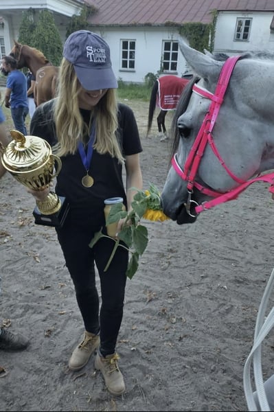 Gut gebaut, proportional und gut bemuskelt. Breite Brust, starker Rücken und trockene Beine. Er hatte nie gesundheitliche Probleme oder Verletzungen. Er hat eine Geländetauglichkeitsprüfung bestanden. Drei Jahre im Renntraining und regelmäßige Starts zeugen von seiner robusten Gesundheit. Unter dem Sattel: Sanft, gehorsam, leicht zu reiten. Arbeitet problemlos mit Stuten. Er folgt gerne den Anweisungen, ist nicht schreckhaft. Er kennt den Straßenverkehr, Hunde und Lärm. Immer motiviert für das Training, absolviert problemlos weitere Runden. Gewöhnt an Auswärtstrainings und erfahrener Turnierpferd. Hauptsächlich startet er unter der Juniorin. Qualifikationen: 1× CEI* 100 km MPJ – 1. Platz. Ausgezeichneter Stoffwechsel, schnelle Antritte an die Barriere, stets sauber und klar im Bewegungsablauf. Herzfrequenz stabil, unabhängig von den Umständen. Gut ausgebildet, arbeitet an der Hand, in gymnastischen Reihen und Cavaletti. Er hat einen bequemen, effizienten Bewegungsablauf. Im Umgang mit der Longe ausgebildet, bewegt sich korrekt an der Longe.