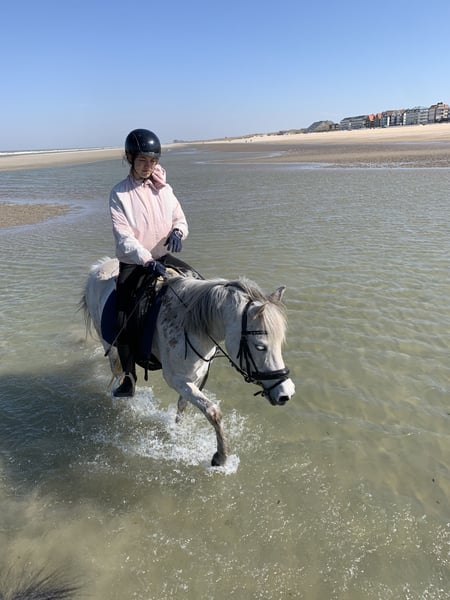 Onze dochter is haar met haar 1,80m helaas ontgroeid: 1,48m Arabier merrie, 12 jaar oud Volle arabische stamboekpapieren, bij de vorige eigenaar (fokker) veulentjes gehad Basis gereden in de piste Super wandelpaard, altijd braaf, kijkt naar niets Ook geschikt voor bvb een mama, die met haar dochter wil gaan wandelen: zij kan ook met een minder ervaren ruiter op stap en blijft altijd netjes bij de andere paarden Staat overdag in de kudde en s’nachts op stal, onderdanig Leert snel Ongelooflijk flink in de omgang Alles netjes gedaan: vaccinaties, tandarts, twee ijzers Gemakkelijk op verplaatsing Enkel voor een super thuis We houden graag contact