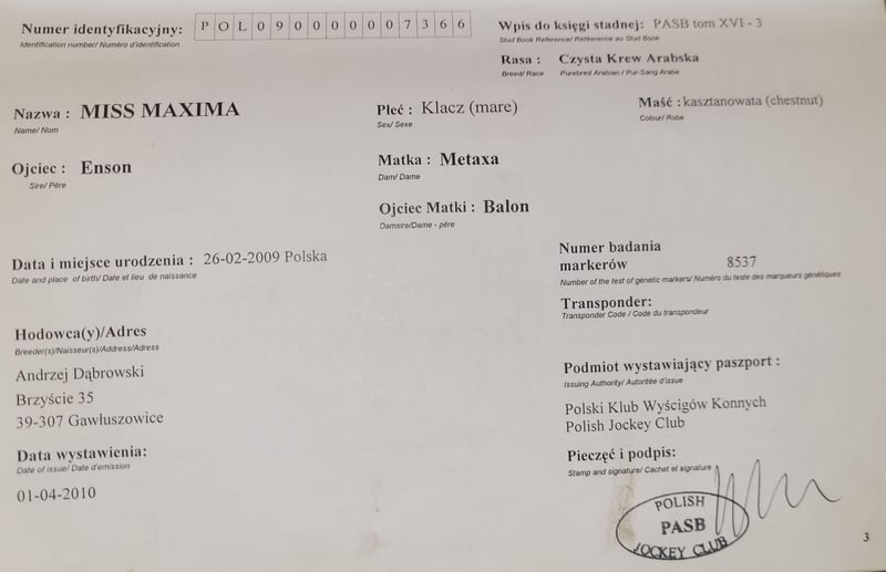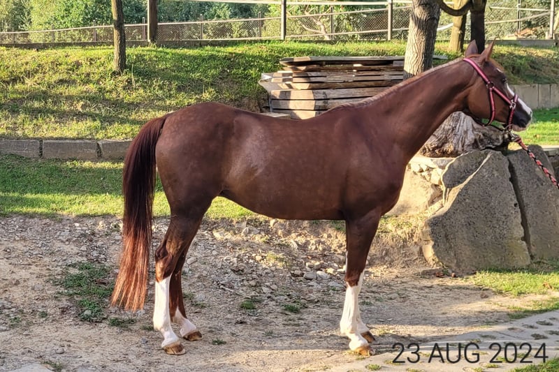 Zum Verkauf steht eine außergewöhnliche, schöne Vollblutaraberstute Miss Maxima (Enson x Metaxa), geboren im Jahr 2009. Sie verfügt über ein offizielles Höhenzertifikat von 148 cm (Ponystatur, Gruppe D). Die Stute beeindruckt durch ihre großzügigen und eindrucksvollen Bewegungen, geprägt von außergewöhnlicher Elastizität, Wendigkeit, Schnelligkeit sowie einer seltenen Technik im Springen für diese Rasse und einem enormen Arbeitseifer. Im Umgang ist sie äußerst brav und ruhig. Im Jahr 2021 begann sie mit dem Sporttraining und nahm in den Jahren 2022 bis 2024 an Springprüfungen der Klasse L und P teil, wobei sie Potenzial für höhere Wettbewerbe zeigte. Leider erlitt sie eine Verletzung (degenerative Veränderungen im Sprunggelenk), die sie vom Sport ausschließt. Dies beeinträchtigt jedoch weder ihre Lebensqualität noch ihre Zuchtfähigkeit. Die Stute befindet sich in kontinuierlichem Training (Longieren, leichte Arbeit unter dem Reiter). Miss Maxima ist die ideale Kandidatin für die Zucht herausragender Sportponys. Ihre Technik, Dynamik und Schönheit garantieren die Weitergabe wertvoller Gebrauchseigenschaften an ihre Nachkommen. Sie ist sowohl für Züchter arabischer Pferde als auch für Liebhaber moderner Reitpony-Zucht geeignet. In der Zucht bewährt, bringt sie Nachkommen mit sehr korrekter Anatomie und edlem Typ hervor. Pedigree: https://www.bazakoni.pl/missmaxima-enson-metaxa Nachkommen: https://www.bazakoni.pl/missempire-empire-missmaxima https://www.bazakoni.pl/mequator-equalion-missmaxima Videos: Bewegung (aktuell): https://youtu.be/WHLtTZr5--E?is=yP7NPqt17odmHfrc Bewegung (vor Verletzung): https://youtu.be/5JDY2B_nCj8?is=atGzC9NDbV6-zTAk Springen: https://youtu.be/jUQmPDYuuSw?is=9OGlbEup-xqcCaNy