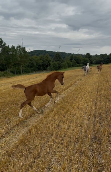 Elenya ist eine außergewöhnlich harmonische, bewegungsstarke Stute, die in jeder Beziehung sehr auffallend ist. Sie hat noch eine Vollschwester. Eine dieser beiden Stuten würden wir abgeben an ein wertschätzendes Zuhause. Beide Eltern sind geritten und beide haben die Verbandsprämie bekommen. Auch Elenya selbst wurde als Fohlen prämiert. Unsere jungen Pferde wachsen in Gruppen auf großen Weiden auf. Im Sommer ganztägig und im Winter in Laufställen mit täglichem Auslauf. Wir füttern individuell. Das heißt, die Pferde werden im Winterhalbjahr jeden Tag aufgehalftert und angebunden. So können alle stressfrei fressen. Wir selber bieten mehr als 50 Jahre Erfahrung in Pferdezucht und -haltung, sowie in der Landwirtschaft.
