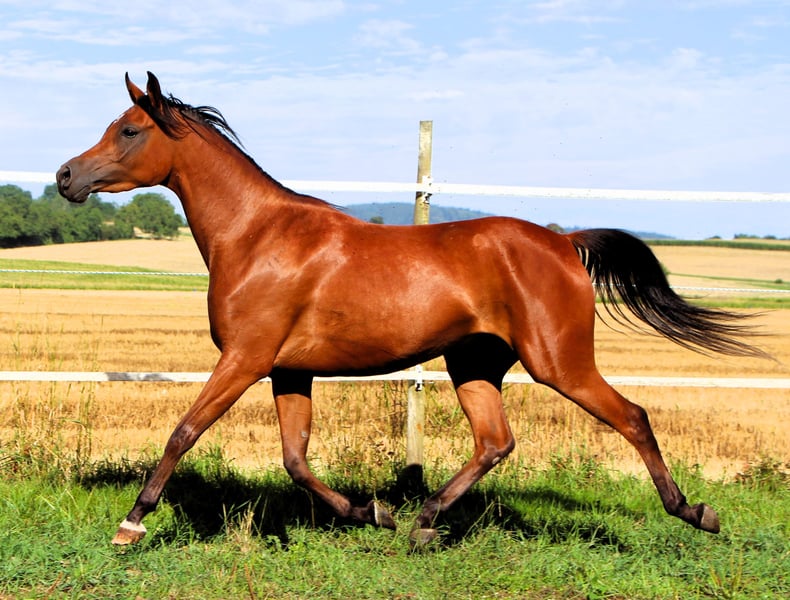 Absolutissima fait honneur à son nom. C'est vraiment une jument absolument magnifique ! Elle est superbe, avec une excellente conformation, des jambes droites, de bons sabots, une jolie tête, de belles allures et elle a un caractère enchanteur. Elle est extrêmement affectueuse, adore les câlins, est curieuse et s'entend bien avec les autres chevaux dans le troupeau. Elle profite encore de sa vie dans le pré avec le groupe de jeunes chevaux, mais elle est prête à commencer à travailler et à découvrir le monde. Étant donné que le pré a une pente et une source, elle possède déjà un peu les prérequis pour devenir un futur cheval de randonnée ou de compétition de distance : elle est sûre de ses pas et n'a pas peur de boire dans des eaux au sol. De plus, sa mère a prouvé ses capacités sur les courses. Absolutissima est située en Alsace, à 67440 Reutenbourg.