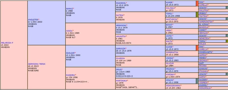 🌟 Occasion rare : Jumente pure race arabe russe du légendaire Haras Tersk 🌟 Avec Melarosa, une chance exceptionnelle de acquérir une jument pure race arabe russe directement issue du haras Tersk. Depuis que Tersk a également vendu la majorité de ses chevaux classiques russes, les juments de cette lignée deviennent de véritables raretés. Sa mère, Germiona Tersk, appartient à la célèbre famille Madeyra – sœur pleine du légendaire Madiar (Drug). La lignée maternelle remonte à l’exceptionnelle Amunitia. Germiona a été importée en 2021 par Faber Arabians directement de Tersk, pleine du remarquable étalon Angleter – vainqueur national et fils du célèbre Namaz. Melarosa se trouve à un âge idéal pour commencer un travail léger au printemps ou pour être directement utilisée en reproduction. Elle est parfaite pour les amateurs de la lignée russe et pour des projets de reproduction de haute qualité.