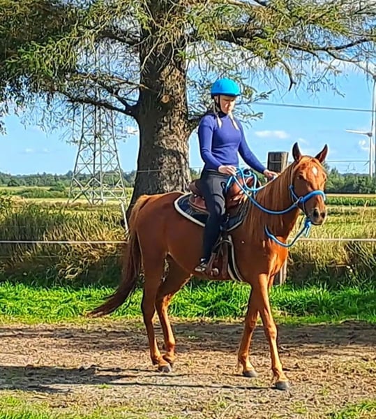 For sale is a beautiful Thoroughbred-Arabian mix mare, born in 2022. With her elegant chestnut coat and a height of 156 cm, she is truly a sight to behold. This talented mare is exceptionally suited for endurance sports and already shows great potential. She is spirited yet manageable, with a friendly character that makes her an ideal partner for ambitious riders. The mare is well-socialized and has already gained initial experience in handling with other horses. She is healthy, vaccinated, and regularly dewormed. If you are looking for a promising endurance horse partner, this Thoroughbred-Arabian mare is just right for you! For inquiries or more information, please feel free to contact us.