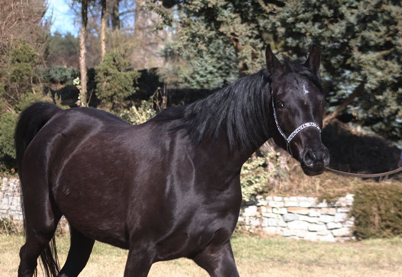 Hermosa yegua de 4 años, de color negro y con homocigosidad por ascendencia, en busca de un nuevo hogar. Cuerpo sólido y correcto, movimientos excepcionales. Es muy alta, se estima una altura final de aproximadamente 1.60 m, actualmente mide ya 1.58 m (última foto). Cara bonita, cuello largo y elegante, patas y cascos correctos. Casi sin blancas, cuerpo y patas completamente negros, solo una pequeña estrella en la frente. Pedigrí interesante: Línea paterna: Kuhailan Afas o.ar. 1930, importado en 1931 a Gumniska (PL) Línea materna: Abeyah o.ar. 1896, importado en 1906 a H. Davenport (US) En su pedigrí se pueden encontrar nombres famosos como Hafati Vogue, Simeon Shai, The Desperado, Ali Jamaal, Bei Shah, Alegro, Probat y otros. Actitud llamativa y segura. Perfecta para reproducción, exhibiciones o para endurance y paseo, ya que posee una de las mejores líneas de sangre en endurance (Wagram****). Registrada en PASB. Lista para la temporada de cría. Precio en el rango superior. WhatsApp +48 513 179 245