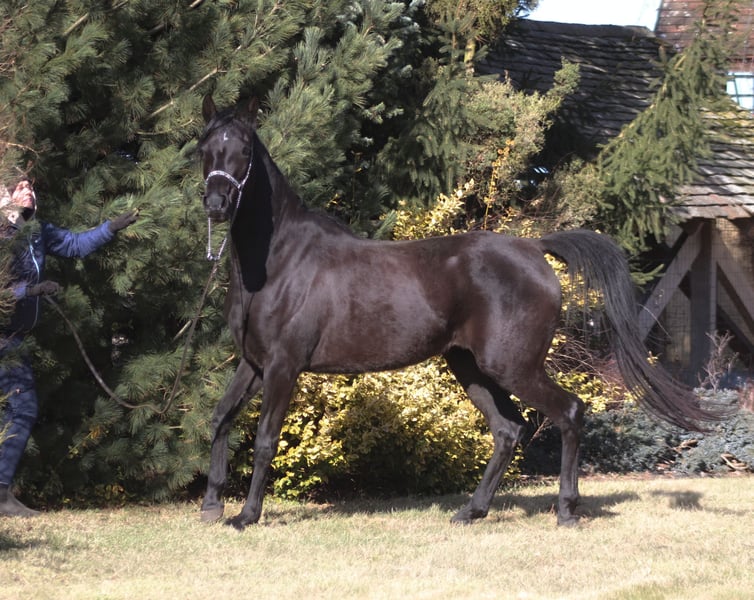 Beautiful 4 yo. mare, black homozygous by parentage looking for a new home. Correct solid body, Super movements. She is very tall, estimate final height 160 cm, currently she is already solid 158 cm (last picture) ! Nice face, beautiful long neck, Correct legs and hoofs. Almost no white at all , all black body and legs only a small star. Interesting pedigree Sire line: Kuhailan Afas or.ar. 1930, imp. 1931 Gumniska (PL) Dam line: Abeyah or.ar. 1896, imp. 1906 H. Davenport (US) In pedigree can find famous Hafati Vogue, Simeon Shai, The Desperado, Ali Jamaal , Bei Shah, Alegro, Probat and more... Showy atittude . Perfect for breeding, show or for endurance/riding - she carries one of the best endurance bloodlines ever (Wagram****) Registered in PASB. Ready for breeding season. Higher price range. WhatsApp + 48 513 179 245