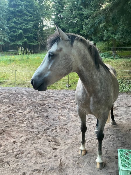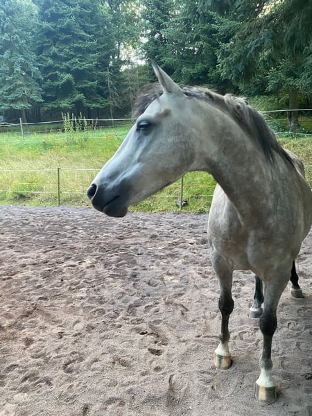 Ari is a 7-year-old Arabian without a pedigree but with an E-pass. He has a rather riding horse type, is compactly built, and measures approximately 14.8 to 15.0 hands. He is absolutely lovable and very handsome. He gets along well with mares, geldings, foals, and retirees. Currently, he is also part of a mixed herd. He is regularly vaccinated, dewormed, and his teeth have been floated. He has beautiful, floating gaits, and videos can be provided upon request. Ari has undergone extensive ground work, free-lunging, and calmness training. He reacts very delicately and is very attentive. He loves walks and rides as a hand horse. He is also comfortable going out alone. He requires an experienced rider who can provide him with security and trust from the saddle and work with him regularly. Last year, he had a single episode of founder, but it was immediately treated by a veterinarian and followed up with hoof care and special insoles, resulting in no lasting damage according to the vet. Since then, he has not been ridden and is being sold as an unridden companion horse. He is not suitable for riders who change frequently, as he needs "his person" to whom he remains loyal. Since I am neither the confident rider he needs nor able to provide suitable care, I have decided to rehome him to a loving, caring new owner. Transport may be possible within the local area at the cost of reimbursement. Further details gladly discussed in person!
