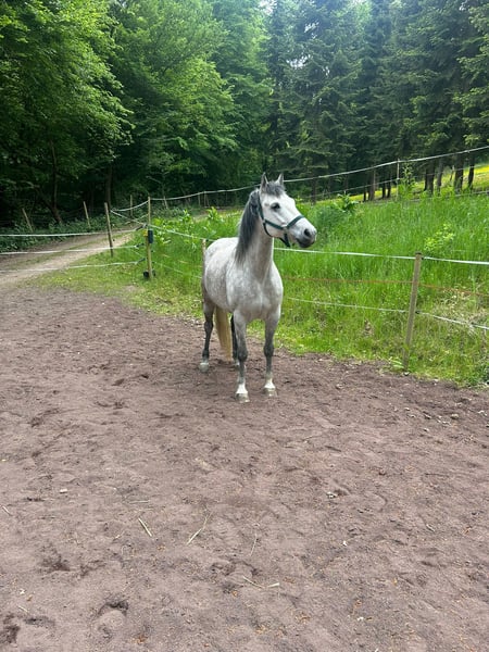 Ari ist ein 7 jähriger Araber ohne Abstammungsnachweis, aber mit E-Pass. Er ist eher im Reitpferdtyp stehend, kompakt gebaut und ca. 1,48-1,50 groß. Er ist absolut liebenswert und sehr hübsch. Er verträgt sich gut mit Stuten und Wallachen, Fohlen und Rentnern. Steht aktuell auch in einer gemischten Herde. Er ist regelmäßig geimpft, entwurmt und die Zähne wurden gemacht. Er hat wunderschöne schwebende Gänge, Videos können auf Anfrage geschickt werden. Er hat viel Bodenarbeit, Freiarbeit und Gelassenheitstraining gemacht. Er reagiert sehr fein und ist aufmerksam. Spaziergänge und Ausritte als Handpferd liebt er. Er geht auch allein raus. Er braucht einen erfahrenen Reiter, der ihm Sicherheit und Vertrauen vom Sattel aus geben kann und regelmäßig mit ihm arbeitet. Er hatte letztes Jahr einen einzigen Reheschub, der aber sofort tierärztlich und danach mit Hufpflegerin und Einlagen sehr gut behandelt wurde, sodass laut Tierarzt keine Folgeschäden entstanden sind. Er ist seitdem nicht mehr geritten worden und wird daher als ungerittenes Beistellpferd verkauft. Er ist nicht für wechselnde Reiter geeignet, da er "seinen Menschen" braucht dem er dann treu folgt. Da ich weder der sichere Reiter bin, den er braucht, noch eine passende Haltung bieten kann, habe ich mich entschlossen ihn in ein neues gutes liebevolles Zuhause abzugeben. Transport ist evtl. gegen Kostenerstattung im näheren Umkreis möglich. Weiteres gerne persönlich!