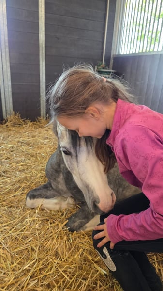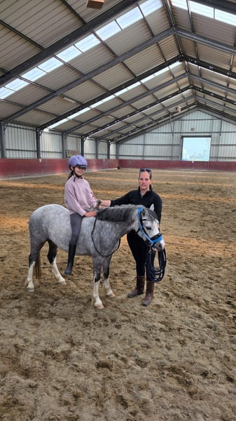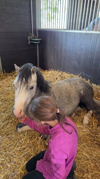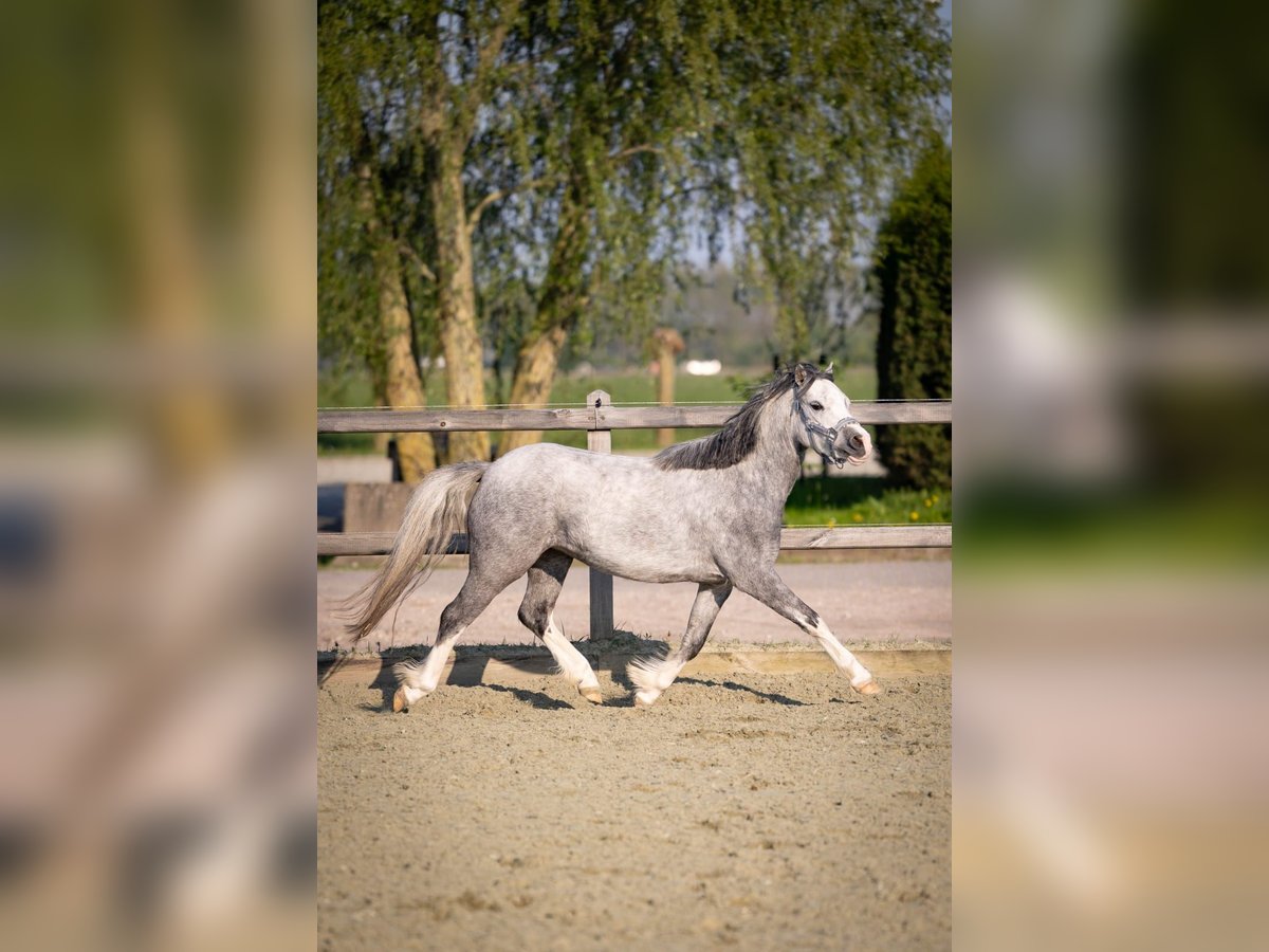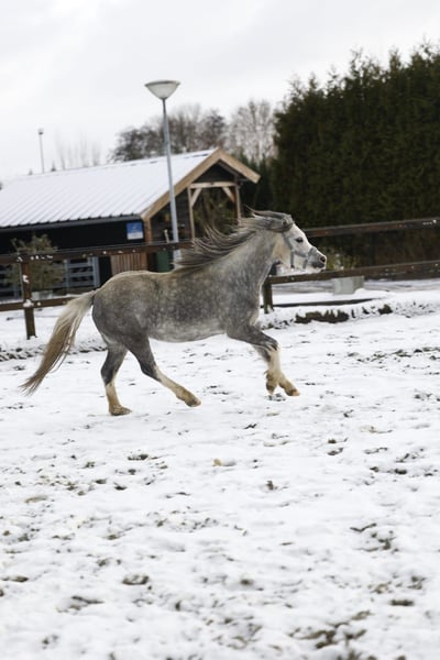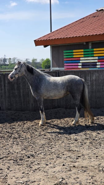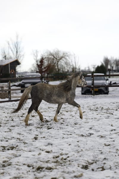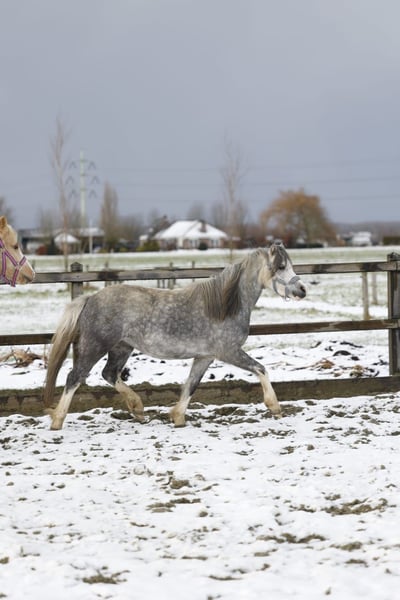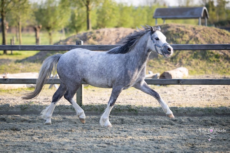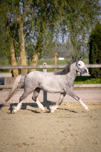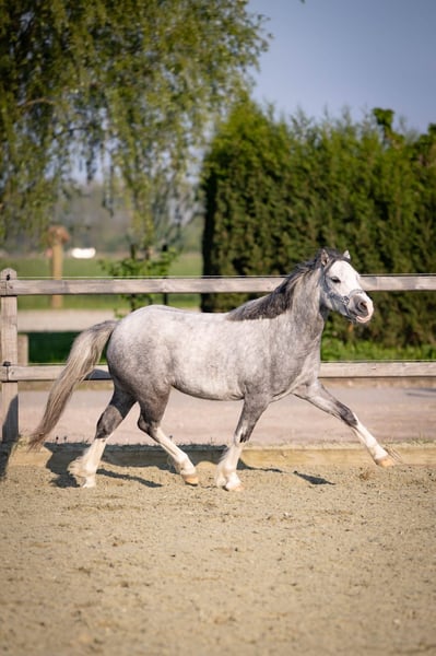 Happy Moon is een hele knappe welsh A merrie van 1.23m uit april 2022, ze is dus bijna 4 jaar. Happy is mega lief en braaf aan de hand. We zijn rustig aan bezig met haar opleiding. Aan de longeerlijn kent ze netjes alle stemhulpen, ook is ze inmiddels zadelmak. We zijn bezig met haar beleren onder het zadel. Ze loopt netjes alle 3 de gangen. Is soms wel vlug en daarom (nog) niet geschikt voor een klein ruitertje. Voor een ruiter die al wat kan of voor iemand die haar wil beleren voor de wagen is zij een onwijs gave merrie. Met een ruiter die netjes verbinding houdt, loopt ze ook makkelijk in aanleuning. Ze heeft 3 mooie gangen, en haar draf is echt fantastisch. Ze loopt met veel gemak! Happy is gewend om in een groep te lopen. Staat bij ons in een loopstal met andere pony's en gaat in een grote groep in de wei of paddock. Ook zou zij een super leuke merrie kunnen zijn om mee te fokken! Heeft vol welsh papier. Haar vraagprijs is 3500,- bij snelle afhandeling is deze enigzins bespreekbaar.