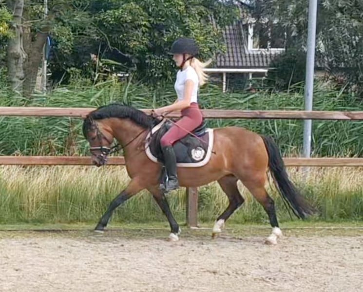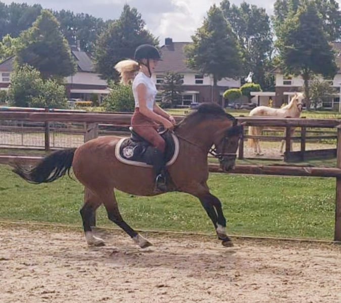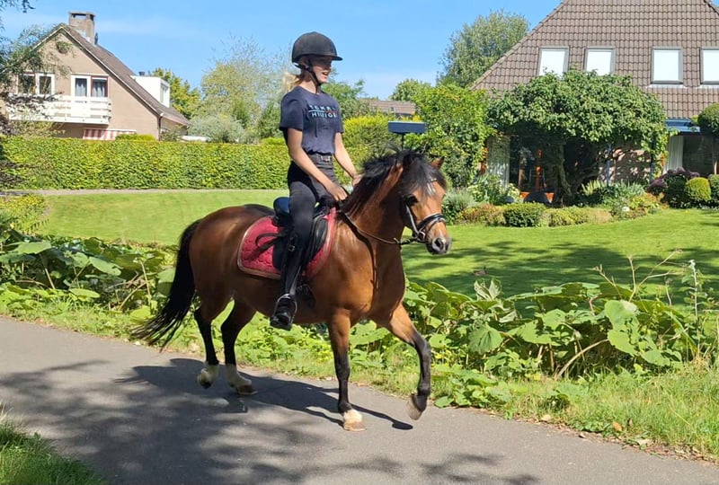 This beautiful star mare with an enormous cuddly nature is ready for a career in sports. Her current rider (1.60m) is getting too big and too old to continue competing with her. Porsche is a 5-year-old star mare, bred from Welsh Section A and falls into the B size category. She has been under saddle for 3 months now and absolutely loves it. She is enthusiastic and willing to work but is 100% honest. She loves jumping! Porsche has a very beautiful and elevated trot with a lot of space in the foreleg, great self-carriage, and an upward canter. She is very good in traffic. The pony was born at a friend of ours, and her entire history is known. Given her training level, I wouldn’t offer her directly for the very smallest riders, but with experienced guidance, she will certainly be the ideal children's pony. Porsche is very friendly and sweet. Always looking for attention and a cuddle and very gentle with small children. Porsche does not get in the way. As training and her diet progress, the price will increase.