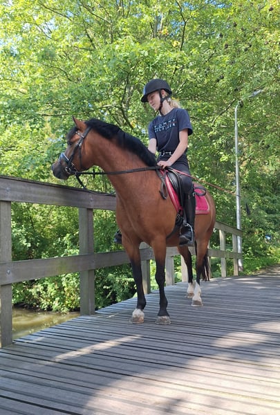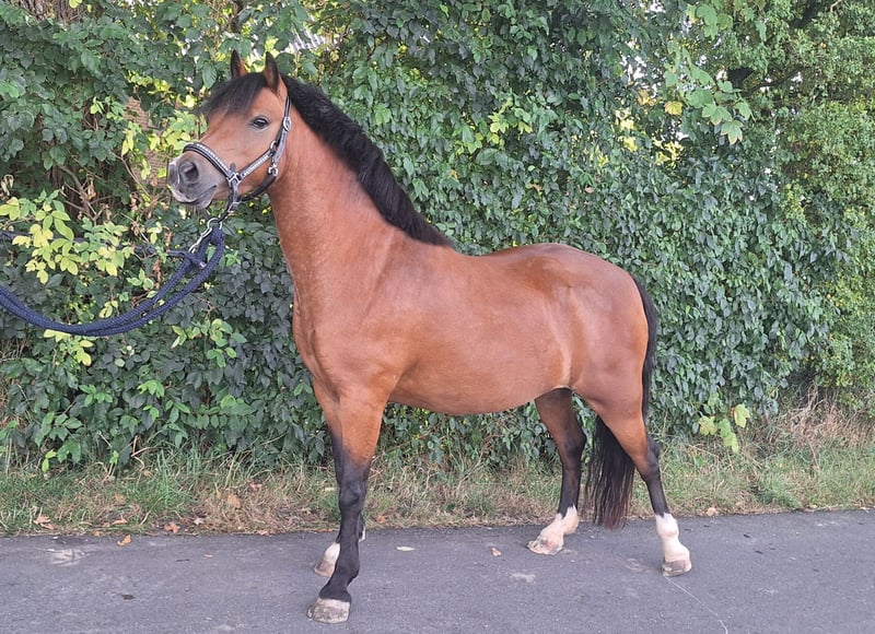 Diese wunderschöne Stermerrie mit einem enorm hohen Kuschelfaktor ist bereit für eine Karriere im Sport. Ihre aktuelle Reiterin (1,60 m) wird zu groß und zu alt, um sie weiterhin im Sport zu fördern. Porsche ist eine 5-jährige Stermerrie, gezüchtet in der Welsh Sektion A und fällt in die B-Größe. Sie ist jetzt seit 3 Monaten unter dem Sattel und findet das super toll. Sie ist begeistert und arbeitswillig, aber absolut 100% ehrlich. Springen findet sie großartig! Porsche hat einen enorm schönen und getragenen Trab mit sehr viel Raum im Vorderbein, viel Selbsthaltung und einem aufwärts gerichteten Galopp. Sie ist super verkehrssicher. Die Pony wurde bei einem Freund von uns geboren, ihre ganze Geschichte ist bekannt. Aufgrund des Ausbildungsstands würde ich sie jetzt nicht direkt für die ganz Kleinen anbieten, aber mit erfahrener Begleitung wird sie sicherlich die ideale Kinderpony sein. Porsche ist sehr gesellig und lieb. Immer auf der Suche nach Aufmerksamkeit und einer Kuscheleinheit und sehr vorsichtig im Umgang mit kleinen Kindern. Porsche steht nicht im Weg. Mit fortschreitendem Training und ihrer Diät steigt der Preis.