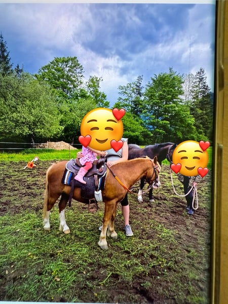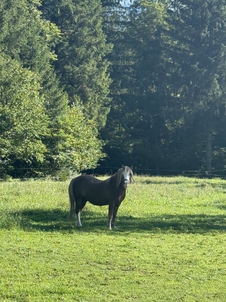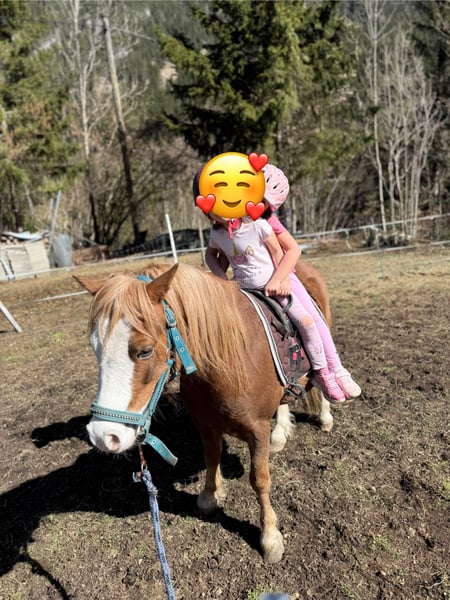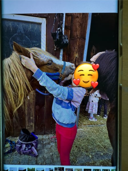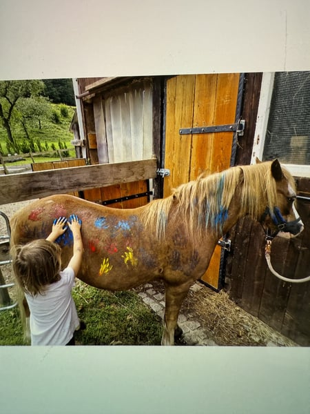 Haribo ist verschmust, verspielt und sportlich. Er lässt sich problemlos von Kindern führen putzen und reiten. Er ist herdenverträglich und brav beim Hufschmied.