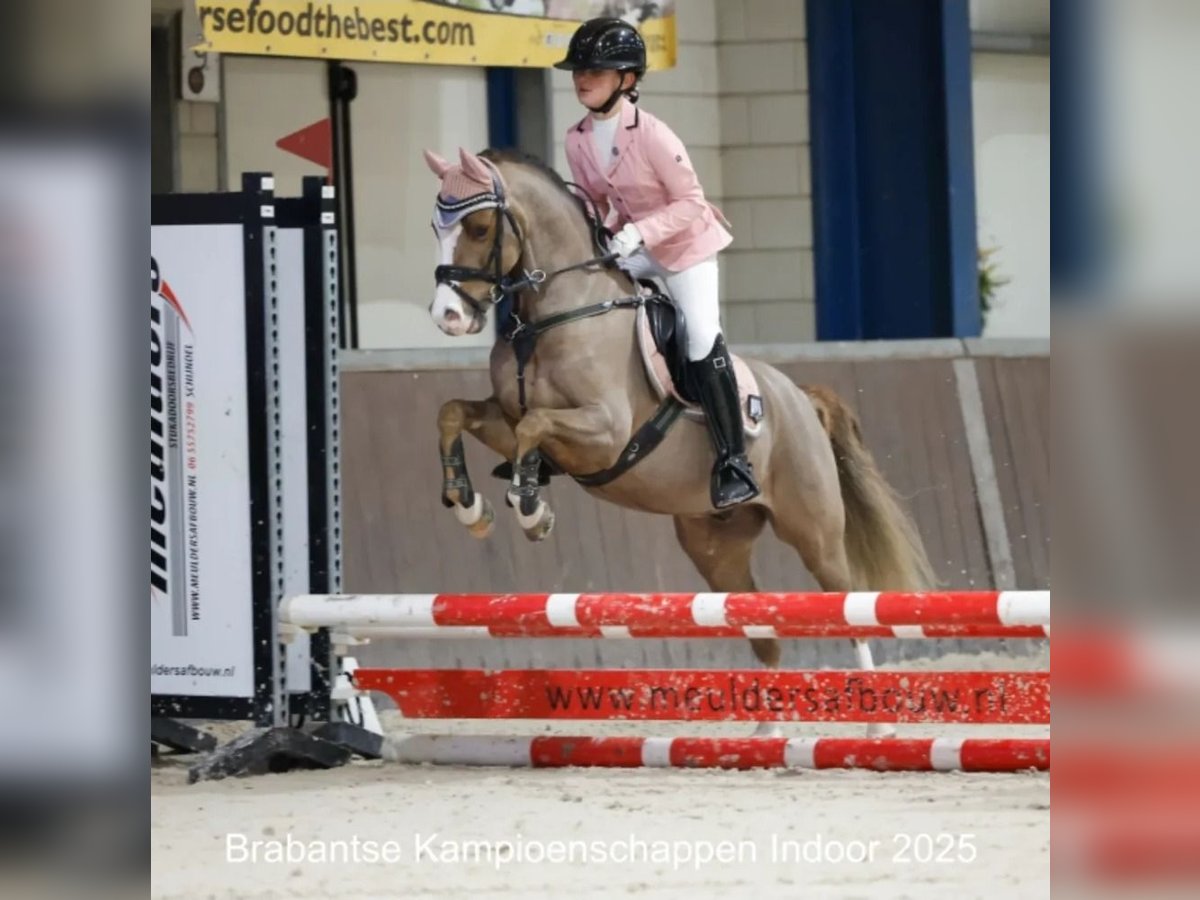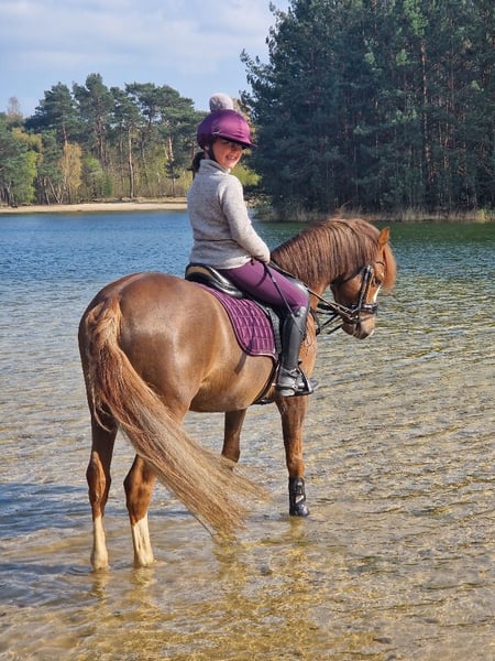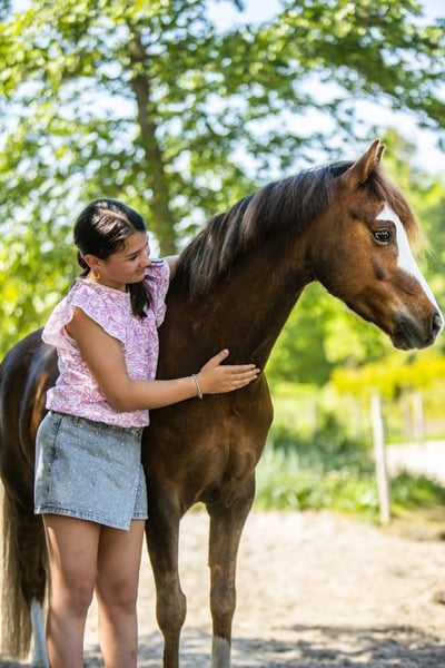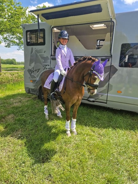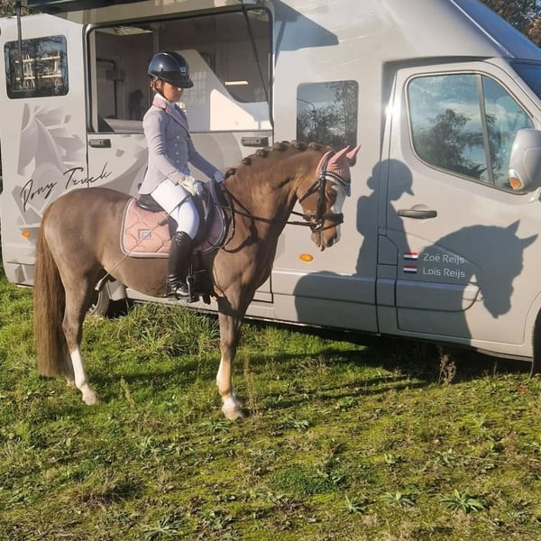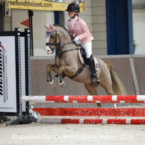 Our sweet Wynswood Elfie WNE is ready for his next rider. He's a super handsome chestnut and 126.5cm. We've had him since he was 3, and my youngest daughter (now 11) taught him everything herself. Elfie is M1 in dressage (almost the highest level for the Netherlands and this type of pony) and jumps 60cm in competitions and 70cm in training. A nice, consistent pace, always good style points! He has more potential but my daughter is getting to big. We participated in a mini-cross, and he jumped it effortlessly. He's also super well-behaved on forest rides. He's always confident in unfamiliar terrain and isn't afraid of anything or nervous. Our youngest daughter has done absolutely everything with him, from serious riding to standing on your pony, sliding off his bottom, dressing up, you name it. This makes him a true children's pony, but with all the qualities of a sports pony. Even small, inexperienced children love riding him! Elfie is sweet with other ponies and is now part of our small herd in our paddock paradise 24/7. On our Instagram @deponyzusjes you can find a highlight of Elfie with a whole bunch of videos from over the years.