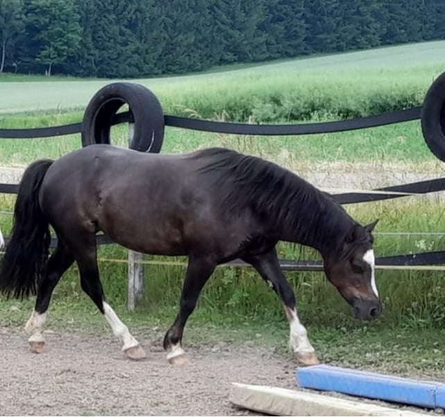 Synod Rosies-Pinup is a lovely and intelligent Welsh C Pony mare (Cob type) with a big heart and lots of potential. Full papers are available. Currently, Rosies is being ridden and worked in the arena and on trails by both children and adults. She particularly enjoys jumping, liberty dressage, and outings/nature walks. She also delights in all other disciplines such as groundwork, lunging, dual activation, equikinetics, long rein work, and fun obstacle courses. Due to her Cob type, she is well-suited for teenagers and small adult riders as well. With proper training, there is certainly even more potential in her! At her previous home, she spent several months in professional driving training and was driven single and pair. Rosies is healthy, barefoot, and the lowest-ranking horse in our small herd of mares in a paddock with other ponies. She appreciates strong bonds with her humans and will choose her special person herself. Rosies will only be placed in the best hands. For more information, please call.