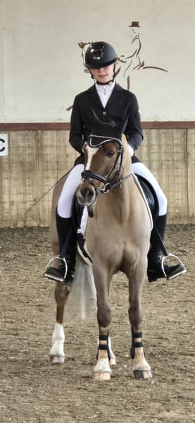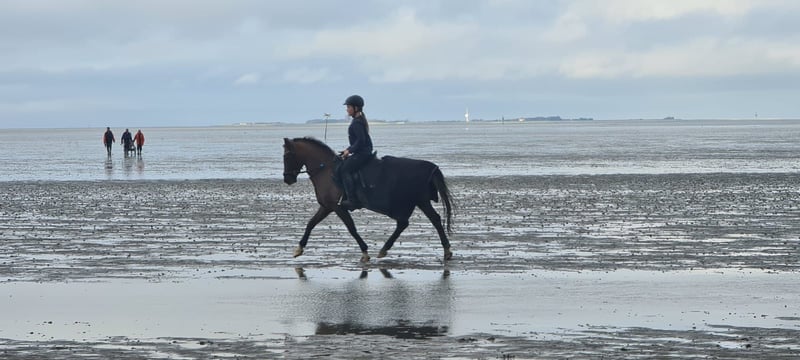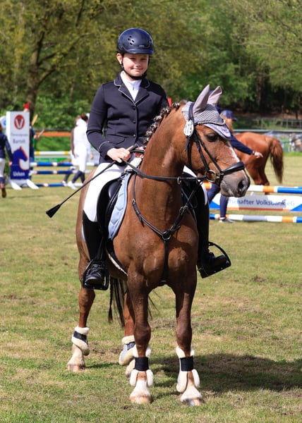 With a heavy heart, we are seeking a new home for our Schnappi due to transitioning to a large horse. This gelding, with his exceptionally beautiful appearance, always catches the eye – a dark chestnut with a grey mane and tail. He is a spirited yet incredibly affectionate pony that quickly bonds with his handler and brings out their best – provided you approach him with clarity and consistency. Not a beginner pony, but with proper guidance, he is a true dream pony and the perfect partner for an ambitious child starting their competition journey! He is experienced in competitions and has placements and wins from dressage training rides, show jumping warm-ups, to E-level show jumping. At the end of last year, he qualified for the final of the Emsland Youth Selection U16 and secured placings in both team and individual rankings at the JVW with my 11-year-old daughter. Competition name: Llamri Twm Sion Cati Schnappi has enough, but not excessive, go and knows no bad habits such as bucking, rearing, or kicking. He is forgiving of his rider’s mistakes and helps out with awkward distances. In the arena, he remains focused and is never clumsy. He is sensitive to aids and easy to handle. An ambitious child with a well-balanced seat and experienced parents would be ideal. A mother-child team would be especially wonderful. He also enjoys riding in the terrain, whether alone or in a group, and natural jumps pose no problem for him. The pony is fully vaccinated, regularly seen by the farrier and dentist, and is accustomed to loading – completely straightforward. He spends the day in a gelding herd on pasture and nights in a paddock box. We wish Schnappi a wonderful family and a loving home where he will be well cared for, appreciated, and supported. We ask €30 for a trial ride including a riding lesson, which will be deducted from the purchase price.