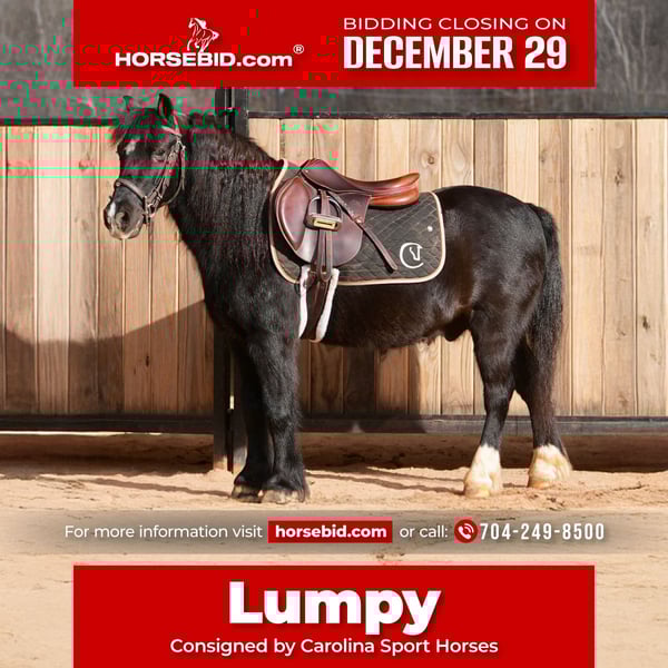 ⚜️ 𝓗𝓮𝓻𝓲𝓽𝓪𝓰𝓮 𝐖𝐢𝐧𝐭𝐞𝐫 𝓒𝓵𝓪𝓼𝓼𝓲𝓬⚜️ Happening now thru MONDAY | DECEMBER 29th - Available EXCLUSIVELY on HorseBid's website! For more details and to register visit: www.Horsebid.com CONSIGNOR CONTACT: Carolina Sport Horses 704-249-8500 LOCATION: Clover, SC BREED: Welsh Pony X REGISTERED: No COLOR: Black HEIGHT: 11.2 AGE: 12 GENDER: Gelding Carolina Sport Horses proudly offers Lump of Coal (“Lumpy”) for your consideration. Lumpy is the kind of pony every parent hopes to find and every child deserves—safe, kind, and genuinely invested in his rider. He is a true confidence-builder whose greatest talent lies in how he makes kids feel in the saddle. At Carolina Sport Horses, we are known for offering horses and ponies that are honestly represented and carefully selected for safety, temperament, and long-term suitability. We understand that purchasing a child’s pony is an important decision, and we strive to make the process transparent and reassuring. Buyers are always welcome to visit our farm and meet Lumpy in person to experience his demeanor firsthand. Lumpy is exceptionally safe, quiet, and dependable. He is patient with young riders, forgiving of mistakes, and unfazed by new situations. His calm nature and steady way of going allow children to relax, trust their pony, and focus on developing their own balance, confidence, and independence. What truly sets Lumpy apart is his kindness and willingness. He genuinely wants to please his rider and is happy to do whatever is asked of him—whether that’s walking quietly on the trail, working in the arena, or simply being a trusted friend. He listens, responds gently, and takes care of his rider, making him an ideal partner for children learning responsibility and horsemanship. A great pony does more than just carry a child—it helps build self-belief. Lumpy gives kids the confidence to try, learn, and grow, all while feeling safe and supported. He is the type of pony that creates lasting memories and lays the foundation for a lifelong love of horses. Contact us at 704-249-8500
