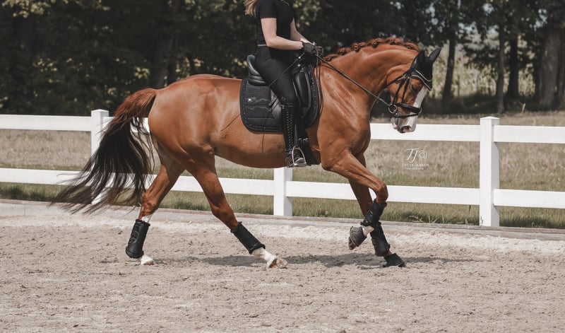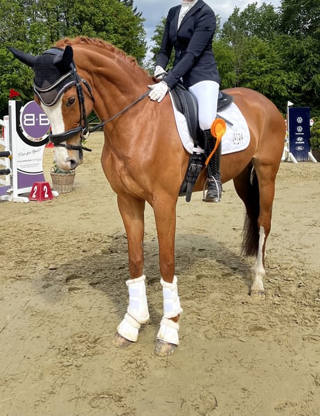 With a heavy heart, I have to part with my unspoiled nine-year-old mare due to personal reasons. I acquired her directly from the breeder nearly two years ago. Susie is a true treasure – a loving and affectionate partner. She is farrier- and loading-safe, making her perfect for an ambitious leisure rider or competitive rider. Whether lunging or working on the arena daily, she is always motivated to work. Since her acquisition from the breeder, she has been continuously trained under professional guidance up to class L. We have achieved placements and wins over two competition seasons. She also mastered her first dressage test at level L with flying colors. Her lateral movements are particularly easy for her. At four years old, she received the State Premium and is therefore also of interest for breeding. I am now looking for a loving home where she can bring joy to her new owners. Susie needs a consistent yet gentle rider who can provide her with security, ideally at a good A-level. Details: State Premium Mare Pedigree: Sir Heinrich OLD x Black Sam Bellamy xx Age: 9 years Height: 165 cm Color: Chestnut I look forward to serious inquiries and hope to find a wonderful new home for Susie! Further information gladly via message/phone. Video can be sent upon request.