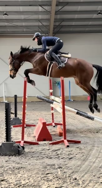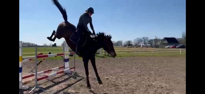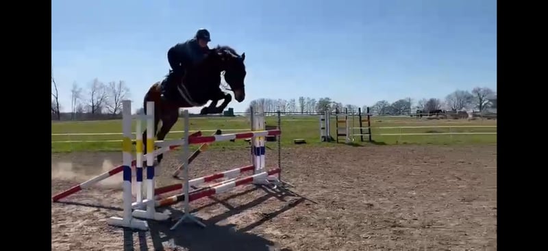 12-jährige Stute, erfahren bis 110 cm unter Amateurbedingungen. Nicht ausgepowert, brav, im Umgang sicher. Sehr gut ausgebildet – fliegende Wechsel, Gegengalopp, Seitengänge, Schulterherein. Im Parcours galoppiert sie gleichmäßig, daher auch für ein Kind geeignet. Hat ein sehr gutes Röntgenbild aus dem Jahr 2023. Sie wurde mit Asthma diagnostiziert, zeigt jedoch keine Symptome. Sie erhält Heusilage und keine Medikamente.