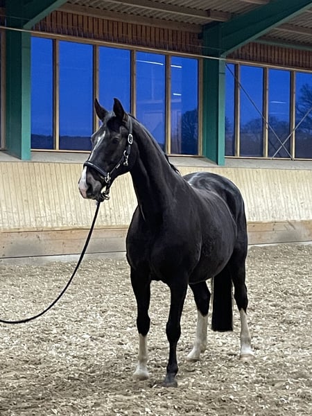 Our very fit Donna Castania can be offered either as a broodmare or for groundwork training. She has been bred through the exceptional stallions Damon Hill and Florestan in dressage, which gives her a very interesting pedigree, and she has often passed on her distinctive dark chestnut coat color. She is the grandmother of two approved stallions, one of whom (For Real) was the 2021 Bundeschampion of three-year-old stallions. A half-sister to Donna Castania is still in our possession; she has won 15 S-level dressage tests and has competed successfully at the short Grand Prix level up to age eleven. Thus, she represents a very interesting dam line. Donna Castania is very sensitive and a pleasure to handle. We are selling her because we already have two highly successful broodmares from her bloodlines. At three years old, she completed an excellent mare performance test with a score of 8.3, but she has not been ridden since and is not offered as a riding horse. Please feel free to contact us by phone at 0170 7741957 if you have any questions.