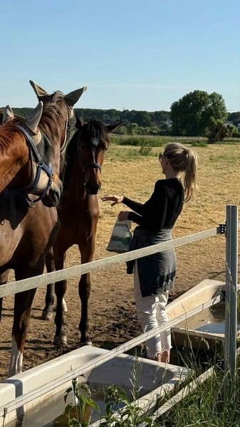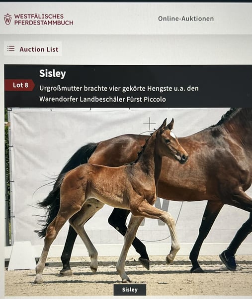 Zum Verkauf steht eine vielversprechende braune Stute, geboren im Jahr 2024. Sie ist aus dem 1. Jahrgang von Sebastino Ps (Secret) Ihre Mutter kommt aus dem Baumeister Stamm, ihre Urgroßmutter brachte 5 gekörte Hengste, u.a Fürst Piccolo. Sissi ist bildschön, wird groß (Endmass 1.76 geschätzt) und bewegt sich sehr schwungvoll und elastisch. Zudem hat sie einen sehr lieben und guten Charakter. Von Geburt an ist sie artgerecht aufgewachsen, mit bestem Futter/Mineralien gefüttert, regelmäßig zum Schmied und geimpft worden. Sie ist ein Juwel für Sport und Zucht. Bei ernsthaftem Interesse kann sie jederzeit vor Ort besichtigt werden.
