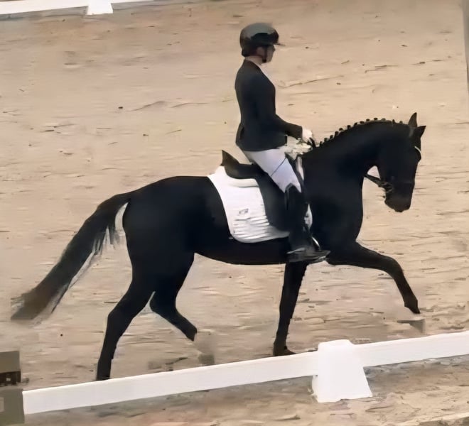 ¡La hermosa Bea proviene de nuestra propia cría! Hasta el día de su monta, Bea estuvo al aire libre durante todo el año y pudo disfrutar de su juventud al máximo. Es una yegua negra de gran belleza y tiene todo lo que se necesita para el gran cuadrilátero. Ya en su primera aparición pública, pudo convencer de inmediato y quedó cuarta en una prueba de caballos de monta. Tanto la carga como el manejo diario, así como el cepillado o el lavado, son cosas que Bea maneja sin problemas. También disfruta mucho de las largas sesiones de caricias. Proviene de una línea materna de gran éxito. La madre y otros hermanos están en la finca y se pueden visitar. Bea cuenta con tres muy buenos aires, está montada, y se dispone de radiografías, incluyendo de la espalda y el cuello, según el veterinario sin hallazgos relevantes. Tiene un pequeño chip que, según el veterinario, no debería causar problemas, pero que sería fácil de quitar.