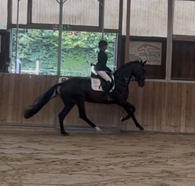 For sale: the promising mare Rock my Heart, aged 4 and standing 17.2 hh. Offered at a favorable price due to a dermatitis issue. With her distinguished pedigree, she combines two proven lines of modern dressage horse breeding: Her sire, Rock Forever NRW, was himself a Bundeschampion, multiple medalist at the World Championships for young dressage horses, and successful up to Grand Prix level. He is considered one of the most rideable and consistent sons of Rockwell, and his offspring are known for their performance in both sport and breeding. His progeny are characterized by high movement quality, strong character, and athleticism — qualities that Rock my Heart already demonstrates impressively. On the dam’s side, she descends from the well-established Rotspon, a son of Rubinstein I, who has long been regarded as a stallion of stamp quality for rideability and reliable inheritance. Rotspon is renowned for producing offspring with excellent riding qualities, an outstanding walk, and natural self-carriage. He has sired numerous successful dressage horses competing at national and international levels. With this lineage, Rock my Heart offers a combination of dynamism, movement strength, and rideability — an ideal foundation for a career in dressage. Her potential was recognized early on: she was awarded as a champion foal. Under saddle, she now confirms these high expectations. Since June 2025, she has been in professional training, showing herself to be easy to ride, eager to learn, and steady-minded. She already impressed in her first young horse class. Rock my Heart impresses not only with an excellent pedigree and quality but also with a friendly, cooperative character. She is an ideal partner for ambitious riders seeking a young horse with prospects for high-level sport. Rocky is already familiar with trail riding, training away from home, etc., and is always reliable and well-behaved, everywhere and at any time. *A fee of 45.00 EUR will be charged for a trial ride.* *The price will increase with further training.*