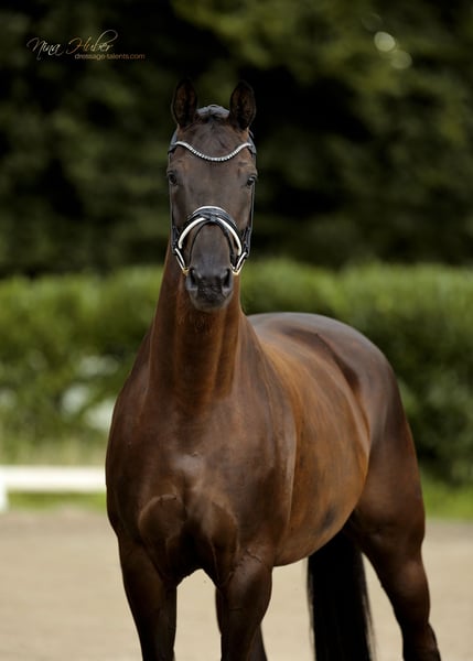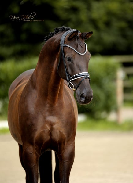 Typically De Niro! A stunning granddaughter of the renowned dressage sire, presented in an especially beautiful and impressive appearance with solid fundamental training. Due to circumstances, she has been lightly promoted so far and has not yet been shown publicly, but she has already been successfully used in breeding. This masculine-looking, sporty mare possesses all the qualities demanded in sport and offers not only a good aptitude for learning. Her current training level is between elementary and medium, and she has recently and successfully tried a change of lead on both sides in a playful and successful manner. Friendly, characterful, and eager to perform – a wonderful prospect for amateurs as well as an ambitious trainer seeking a well-matured horse to develop, recognizing her still untapped potential. Not yet shown or registered publicly. TüV (veterinary inspection) good.