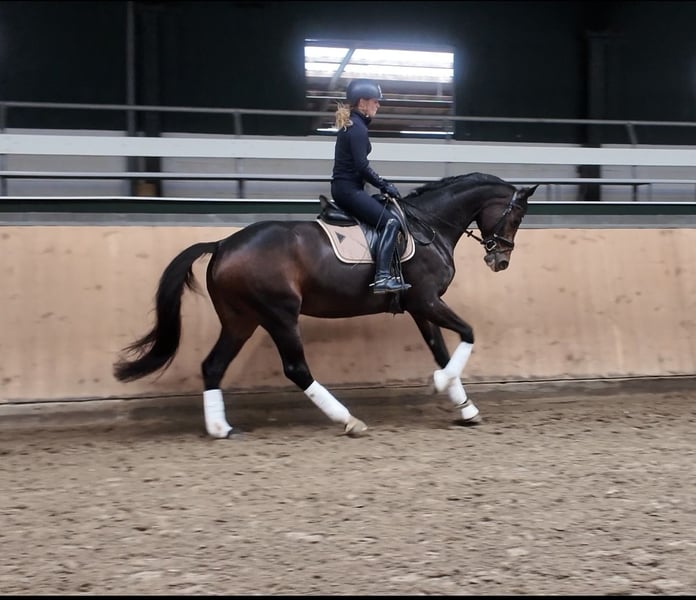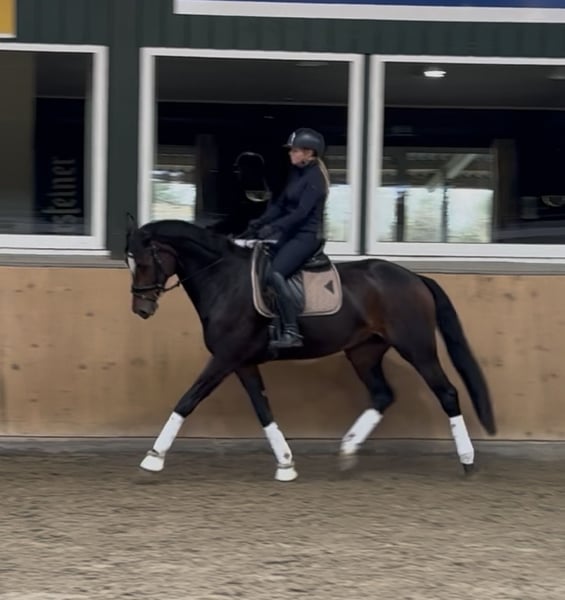 Expressive dressage mare by Zoom with great potential for movement We are offering a 2018-born, dark bay dressage mare by Zoom, who impresses with her quality and remarkable dynamic movement. The mare stands approximately 1.75 meters tall and features outstanding basic gaits with plenty of scope. She is trained to L-level and shows promising talent starting from M-level exercises. She has already demonstrated her sporting ability: - Won A-dressage with a score of 7.8 - Placed in Stil-A jumping with a score of 8.4 She is a very intelligent and eager learner, quickly understanding and executing new lessons. Due to her enormous movement potential, she is best suited for an experienced rider who can nurture her qualities and provide correct training. Minor veterinary findings are available but do not limit her sporting suitability. An exciting opportunity for ambitious dressage riders seeking a horse with future potential in competitive sport. Absolutely well-behaved and people-oriented in handling. Can be loaded alone and goes to the blacksmith without assistance. Serious inquiries are welcome; please contact us for more information.