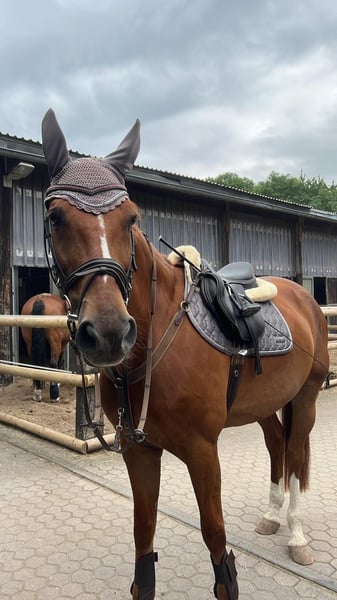 Nach langer Überlegung suchen wir für unseren 15-jährigen Westfalen Wallach Forcolino / Franz ein neues zuhause und liebevolle Hände. Er ist sicheres Springpferd, springt mit viel Freude und gibt dem Reiter Sicherheit. Er möchte immer auf die andere Seite, auch wenn er an ungewohnten Sprüngen schon mal guckt. Er hat gutes Springvermögen, viel Erfahrung und eignet sich daher gut als toller Lehrmeister für einen sportlichen Reiter, auch mit wenig Erfahrung im Springen. Er rettet jede Distanz und vergibt viele Reiterfehler. Insgesamt springt er auf gutem A/L Niveau. In der Vergangenheit ist er auch in der Vielseitigkeit geritten worden, dies haben wir aber nicht weiter gefördert. In der Dressur befindet sich auf gutem A / L Niveau mit Potential für mehr. Zum regelmäßigem Trainingsprogramme gehören, Bodenarbeit, longieren, Freispringen, sowie regelmäßige Lehrgänge zum Working Equitation – hier lernt er schnell und macht konzentriert mit. Er geht sehr gerne ins Gelände, zeigt sich dort unerschrocken, macht jeden Quatsch mit und ist immer gut händelbar. Er geht alleine oder in der Gruppe raus, kennt Straßen, Landmaschinen, Trecker, Hunde und ist entspannt dabei. Im Umgang ist er ein Schatz, ob beim Spazieren gehen, putzen, grasen sowie im Umgang mit Kindern. Mit seinem wunderbaren Charakter ist er ein treuer Kumpel und toller Partner an der Seite seines Reiters. Daher braucht er auch seine Bezugspersonen, die er kennt – dann ist er absolut loyal ist und für jeden Spaß zu haben. Er ist das absolute Verlasspferd, zeigt uns allerdings, dass er den Druck auf Springturnieren nicht mehr möchte. Im Parcours wird er gestresst, verweigert und verfällt in alte Abwehrmuster einschließlich steigen, was er sonst nicht tut. Wir möchten ihm Springturniere nicht mehr zumuten. Dressurprüfungen, Lehrgänge, Auswärtstraining sind kein Problem. Dies ist der Grund, warum wir ihn verkaufen. Der größte Wunsch meiner Tochter ist weiterhin Turniere reiten zu können, sich dort weiterzuentwickeln. Klinisch ist er einwandfrei. Es liegen aktuelle Röntgenbilder (Rücken) aus März 2025 vor – ohne Befund, keine Arthrose oder Auffälligkeiten. 2021 haben wir eine große AKU gemacht, ohne Befund. Er geht problemlos auf den Hänger, ist schmiedefromm. Er ist vorne beschlagen, kann bei anderem Untergrund aber auch 4-fach beschlagen werden. Er steht zurzeit in einer Paddockbox, mit täglichem Paddock oder im Sommer mehrere Stunden in der Wallachherde auf der Wiese. Wir wünschen uns ein 5 – Sterne zu Hause in dem Franz Familienmitglied wird, mit einem liebevollen Umgang und wo er weiterhin sportlich und fair geritten und gefördert wird. Er wird ausschließlich in gute und verantwortungsvolle Hände abgegeben. Bei ernsthaftem Interesse freue ich mich über eine Nachricht oder Ihren Anruf: 0176/98809156 Weitere Informationen, Videos und Fotos auf Anfrage. ❌ keine Händler-Anfragen ❌ kein Schulbetrieb ❌ zur Verfügung stellen, ist ebenfalls keine Option