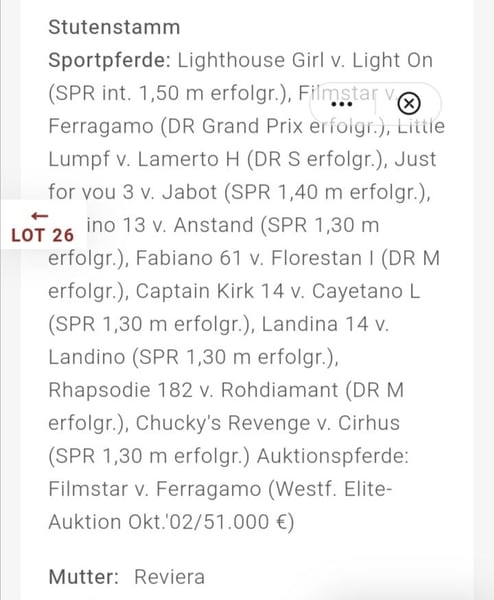 Habsburg ist ein sehr schicker und bewegsstarker Sohn des High Quality, welcher ein Vollbruder des hoch erfolgreichen High Motion ist. Seine Mutter Carlotta hat erfolgreich ihre SLP abgelegt und bereits 4 Fohlen gehabt. Habsburg wird voraussichtlich sehr groß werden und ein Endmass von 1,75+ Stm erreichen. Die Großmutter Reviera stammt aus einer sporterfolgreichen Mutterlinie, die erfolgreiche internationale Nachkommen in Dressur und Springen, u. A. Donna Karacho Video : https://youtu.be/T3FCV9O4w-g.Weitere Videos auf Anfrage Die gemachte Angaben sind unverbindliche Beschreibungen und stellen keine zugesicherten Eigenschaften dar. Der Verkäufer haftet nicht für Irrtümer, Eingabefehler und Datenübermittlungsfehler