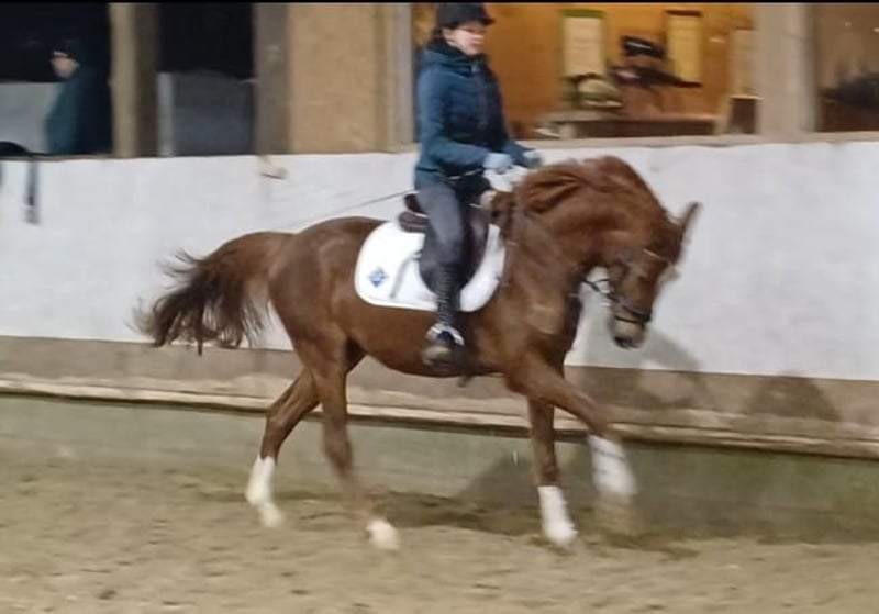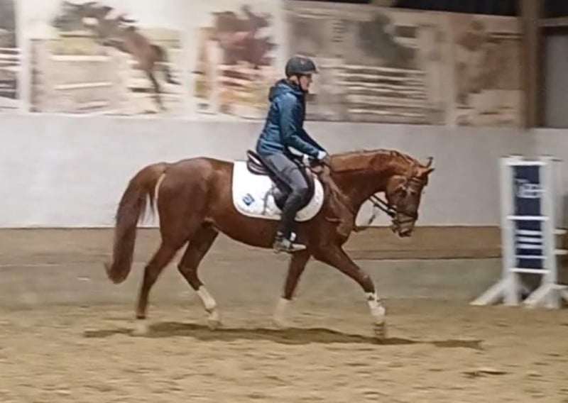 V: Hickstead Blue x MV: Coronas x MMV: Carthago, Wallach Westfale, Stckm. 154cm, 4j. brav Springen, Dressur, Hunter, optimal für Mädchen Zum Verkauf steht dieser wunderschöne, sympathische, witzige 4j. Wallach, mit allerbester Springabstammung, 3 guten Grundgangarten, Springvermögen und einem Charakter aus Gold. "Herkules" wurde schonend angeritten und zeigte sich dabei stets brav, schön rittig, geht einfach am Zügel und lässt sich wunderbar sitzen. Er ist alterentsprechend sehr brav und unerschrocken. Kein steigen, kein Buckeln, kein Durchgehen. Er springt ganz einfach einen kleinen Parcours, sowie einzelne Sprünge auch höher. Er ist willig, mutig und geschickt dabei. Bei mir wird er auch von einem 13 jährigen Mädchen mitgeritten und gesprungen was absolut unproblematisch ist, es klappt sogar ganz wunderbar. Herkules ist ein toller Youngster mit Potenzial fürs Springen, als Hunter, sowie für die Dressur. Sein hübsches Aussehen und seine nette Art machen Ihn einfach perfekt! Herkules läuft barhuf, wohnt in einer Box mit Außenfenster, geht bei mir mit 2 Wallachen aufs Paddok, kennt Führmaschine, Außenplatz, Halle und Longe. Für dieses tolle Pferd wünsche ich mir einen Bestplatz mit Sozialkontakten, Winterauslauf und Abwechslung. Er wird nur in beste Hände verkauft, keine Händler, kein Notverkauf! Verkauf erfolgt im Auftrag. 0170 9 333 000 Jana Ich freue mich auf nette Anfragen:-)