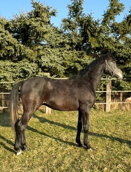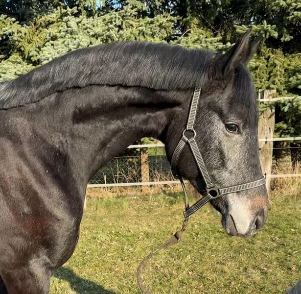 Indiamo ist ein großer Wallach (4 Jahre, Rappschimmel) und ist Nachkomme des Trakehner Invincible Sir. Der Vollblutaraberhengst Dschehim ox liefert über die Mutterseite einen wertvollen Blutanschluss, der das Pedigree dieses Hengstfohlens hochinteressant abrundet. Weiterhin auf der Mutterseite finden sich weiterhin Larome (Landgraf - Roman (von Ramzes xx) - Manometer xx) - Wanderer (Wagner (von Wendekreis) - Glander) - Pik Koenig. Im Stutenstamm finden sich Dressur- und auch Springpferde, sowie gekörte Hengste. Die Mutter ist Staatsprämientute und war als Fohlen beim Fohlenchampionat in Neustadt/Dosse drittplatzierte bei den dressurbetonten Stutfohlen. Auch Tausch mit einem älteren, reitbaren Pferd (Schulpferd oder ausrangiertes Sportpferd) möglich. Bei Interesse melden Sie sich bitte nur telefonisch oder per Whats App oder SMS unter der Nummer 0049 1725488966.