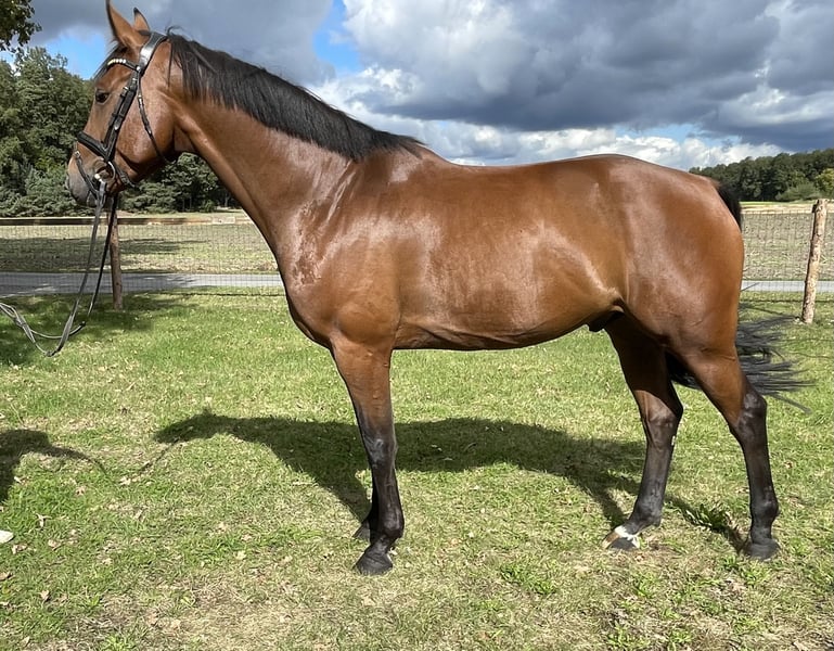 For sale is a 5-year-old brown gelding standing at 166 cm. Cloverleaf completed his first A show jumping competition last week (October 4th) with a solid clear round and a score of 7.4. In the course, he showed himself to be fearless and with a good work ethic; in the warm-up area, he was a bit afraid of oncoming horses but was manageable. At the jump, he demonstrates good scope, carefulness, and a nice bascule. He gives a secure and pleasant feeling and has a good, manageable pull to the jump. He is pleasant to ride in dressage and also behaves well out on the trails; he has successfully mastered his first experiences at the beach and in the mudflats. Due to his size and compact build, we could easily imagine him as a girl’s/lady’s horse. He is familiar with dogs, cats, goats, pigs, lunging systems, tractors, and all the equipment typically found on a farm, and he is herd-compatible. He is used to daily turnout and being stabled at night. Good X-ray images are available; he has a small, irrelevant chip in the left hind fetlock. Because of this and his apparent fear of other horses/traffic, he is being sold below value. A trial ride is possible at any time.