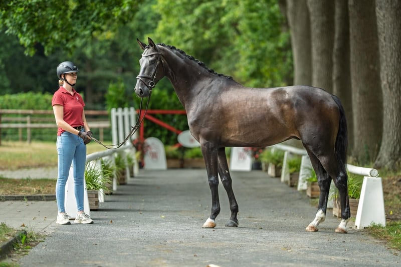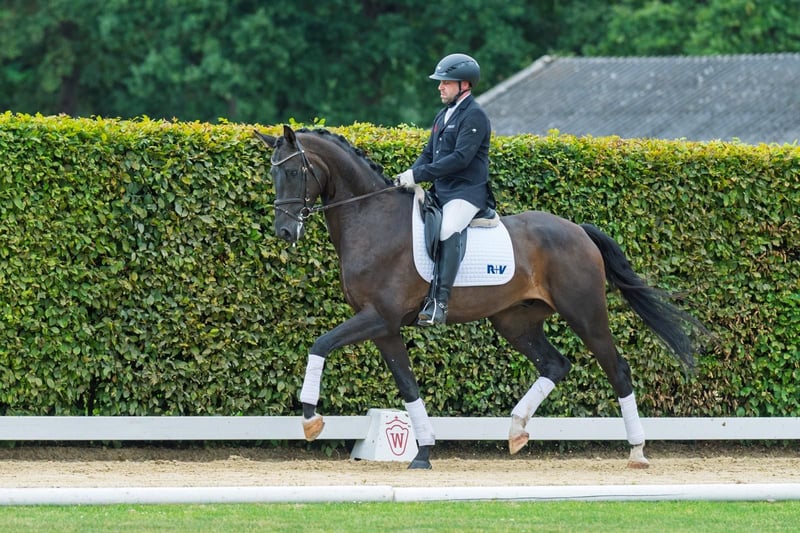 El extremadamente hermoso Jo entusiasma cada día con su excelente calidad básica y su carácter encantador. Es sensible, trabajador y con muchas ganas de aprender. Se deja trabajar muy bien y seguramente podrá aprender todo. Está muy bien clasificado en las pruebas de caballos de doma de la clase A, y se muestra muy fuerte de nervios y concentrado en el torneo.