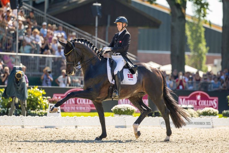 Il magnifico Jo incanta ogni giorno. Il suo talento per il dressage gli è stato trasmesso dal padre Jovian, doppio campione del mondo di dressage e vincitore internazionale di S dressage. Attivo con il posteriore, ottima capacità di raccolta, apprendimento rapido e resistenza fanno sperare in un grande futuro come cavallo da dressage! Si lascia lavorare molto bene e sicuramente potrà imparare tutto. È molto ben piazzato nella prova di dressage classe A, si mostra molto stabile e concentrato anche in gara. È estremamente facile da montare, persino dai bambini! Quasi si muove da solo al guinzaglio. L’ultima immagine mostra il padre.