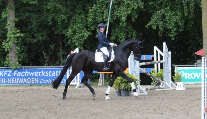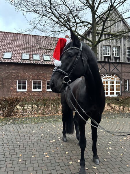 Scottish Peat – a jet-black giant with a heart of gold Scotty is an impressive, large-framed gelding with genuine presence – a horse that quickly captures your heart. Despite his XXL size, he is very sensitive to riding aids, easy to handle, and always fair in his dealings. He comes directly from the breeder and is a son of the Hanoverian dressage champion Spökenkieker, from a highly successful dam line. A recent X-ray examination is available, and he has a clean radiological report, including a discount due to vocal cord correction. Sportingly, Scotty has already proven himself: multiple high placements in young horse classes and A-level dressage competitions. Currently, he is in L-level training and already knows extended trot, simple changes, and short turns – always motivated, honest, and eager to learn. Scotty loves variety: hacking (absolutely trail-safe), pole work, jumping, free jumping, ground work, or simply cuddling – he’s up for any activity and always enthusiastic. His gentle, loving nature makes him a very special partner who strives to please his rider. An extraordinary, jet-black dressage prospect with a lot of heart, quality, and potential – ideal for riders seeking a large horse with a big character.