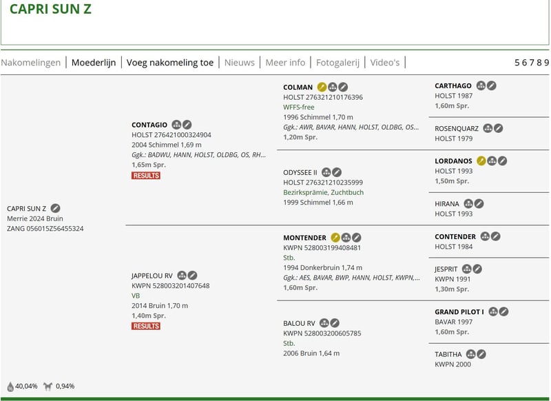 For Sale – Capri Sun Z Zangersheide Mare – 2024 – Sport & Breeding Potential Promising young mare Capri Sun Z, bred from a strong international show jumping lineage. 🧬 Pedigree Sire: Contagio (by Colman x Carthago) – international 1.65m show jumping level Dam: Jappelou RV – performance mare with 1.40m jumping record Dam’s Sire: Montender – Olympic gold medalist and proven Grand Prix sire Further along the dam line, we find Grand Pilot I, a well-known producer of 1.60m show jumpers. ⭐ Why Capri Sun Z Is Interesting ✔ From a performance lineage producing 1.40m – 1.60m sport horses ✔ Modern sport conformation with length, strength, and athletic build ✔ Exciting combination of Holstein power (Carthago/Contender) with modern sport bloodlines ✔ Suitable as a future sport horse or breeding mare 🐎 Type Capri Sun Z is a correctly conformed young mare with a strong hindquarters, good shoulder, and sporty appearance. She exhibits a modern look highly sought after in international show jumping. 🎯 Ideal for riders aiming to develop a future show jumper breeders seeking a strong dam line with proven sport results investors in young sport horses 📍 Location: Europe 📩 More information available upon request