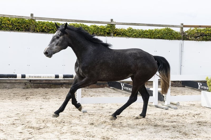 Grey mare, long-lined and strong model with a good attitude. Shows carefulness on the jump and shows that she is willing to cooperate. Is still very green. Sire CONTAGIO – 1.60/1.65m International showjumper, passes on scope, reflexes and attitude. Proven bloodline with multiple offspring at high level. Dam RAYON DE SOLEIL VAN DE GROTE HOEF Young mare, bred out of a strong performance-oriented line. Damline / family Granddam: HEMKE DE KALVARIE – 1.20m Further in the line: PUSKAS DE KALVARIE – 1.55m QUATTRO DE KALVARIE – 1.50m OTTO DE KALVARIE – 1.55m (approved stallion) PLATINI DE KALVARIE – 1.60m CHIC HIN D’HYRENCOURT – 1.60m VIRTUOSE D’HYRENCOURT – 1.60m (approved stallion) UNIQUE D’HYRENCOURT – 1.55m ALANIX HERO Z – 1.50m Approved stallions in the line incl.: OTTO DE KALVARIE, VIRTUOSE D’HYRENCOURT